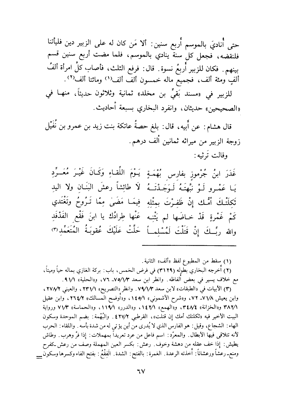فَكَانَ لِلزُّبَيْرِ أَرْبَعُ نِسْوَةٍ، قَالَ: فَرَفَعَ الثُّلُثَ، فَأَصَابَ كُلَّ امْرَأةٍ أَلْفَ أَلْفٍ وَمَائَةَ أَلْفٍ، فَجَمِيْعُ مَالِهِ خَمْسُوْنَ أَلْفَ أَلْفٍ (1) وَمَائِتَا أَلْفٍ (2) .