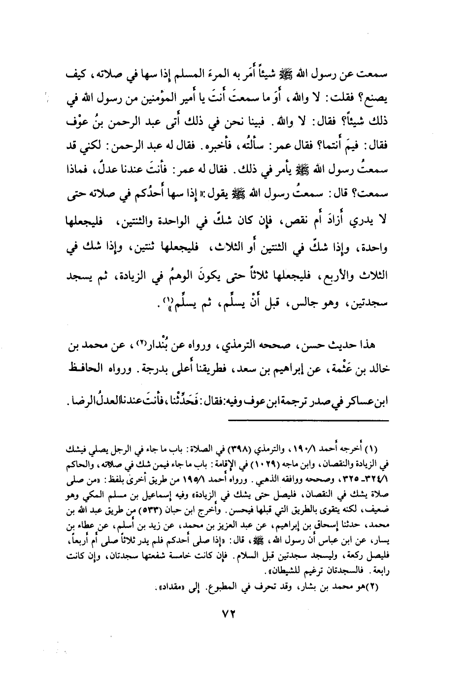 (1) أخرجه أحمد 1 / 190، والترمذي (398) في الصلاة: باب ما جاء في الرجل يصلي فيشك في الزيادة والنقصان، وابن ماجه (1029) في الاقامة: باب ما جاء فيمن شك في صلاته، والحاكم 1 / 324 - 325، وصححه ووافقه الذهبي.