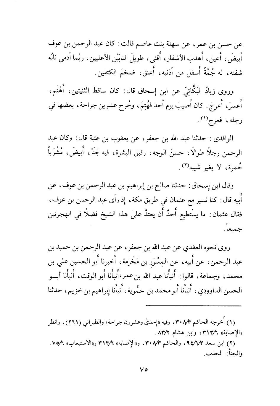 كُنَّا نَسِيْرُ مَعَ عُثْمَانَ فِي طَرِيْقِ مَكَّةَ، إِذْ رَأَى عَبْدَ الرَّحْمَنِ بنَ عَوْفٍ، فَقَالَ عُثْمَانُ: مَا يَسْتَطِيْعُ أَحَدٌ أَنْ يَعْتَدَّ عَلَى هَذَا الشَّيْخِ فَضْلاً فِي الهِجْرَتَيْنِ جَمِيْعاً.