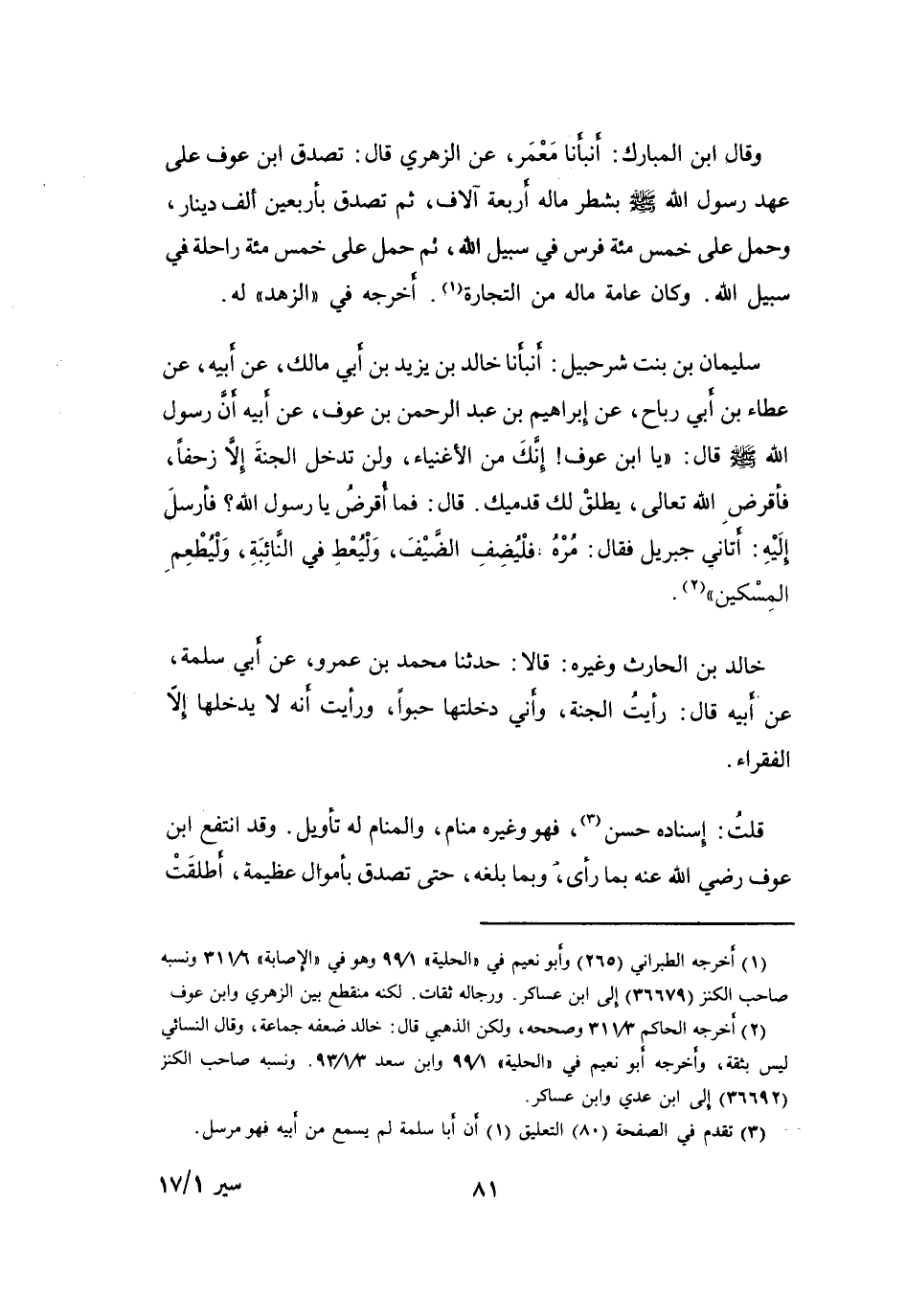 قُلْتُ: إِسْنَادُهُ حَسَنٌ (3) ، فَهُوَ وَغَيْرُهُ مَنَامٌ، وَالمَنَامُ لَهُ تَأْوِيْلٌ، وَقَدِ انْتَفَعَ ابْنُ عَوْفٍ -رَضِيَ اللهُ عَنْهُ- بِمَا رَأَى، وَبِمَا بَلَغَهُ، حَتَّى تَصَدَّقَ بِأَمْوَالٍ عَظِيْمَةٍ، أَطْلَقَتْ