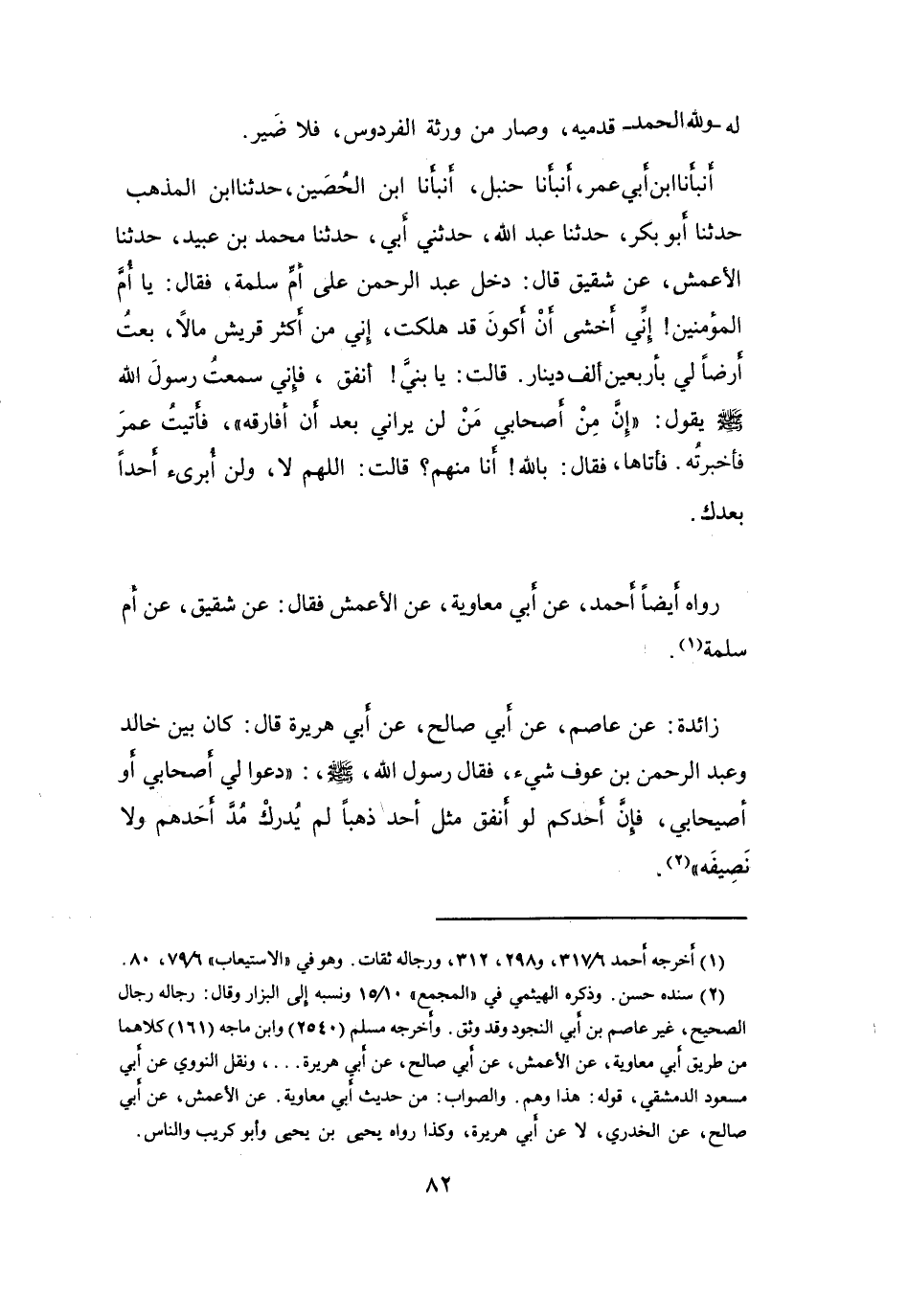 أَنْبَأَنَا ابْنُ أَبِي عُمَرَ، أَنْبَأَنَا حَنْبَلٌ، أَنْبَأَنَا ابْنُ الحُصَيْنِ، حَدَّثَنَا ابْنُ المُذْهِبِ، حَدَّثَنَا أَبُو بَكْرٍ، حَدَّثَنَا عَبْدُ اللهِ، حَدَّثَنِي أَبِي، حَدَّثَنَا مُحَمَّدُ بنُ عُبَيْدٍ، حَدَّثَنَا الأَعْمَشُ، عَنْ شَقِيْقٍ، قَالَ: