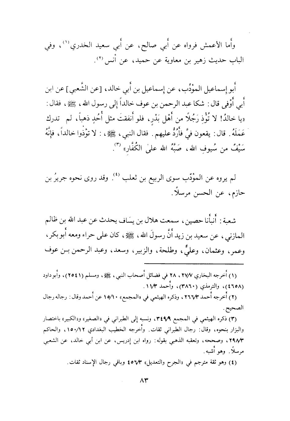 (1) أخرجه البخاري 7 / 27، 28 في فضائل أصحاب النبي، صلى الله عليه وسلم، ومسلم (2541) ، وأبو داود (4658) ، والترمذي (3860) ، وأحمد 3 / 11.