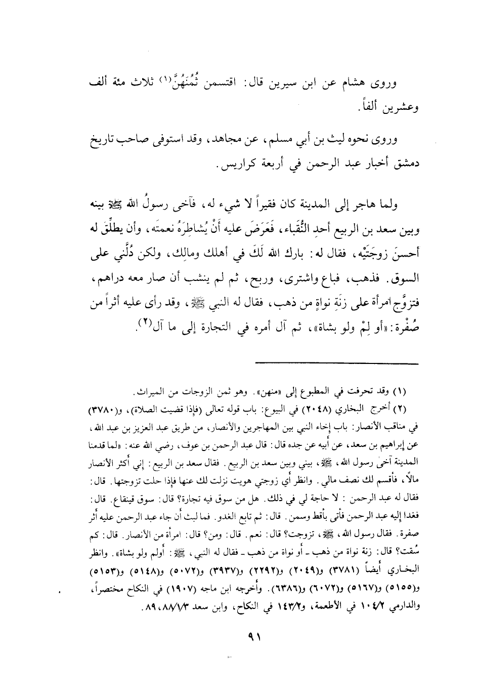 (2) أخرج البخاري (2048) في البيوع: باب قوله تعالى (فإذا قضيت الصلاة) ، و (3780) في مناقب الانصار: باب إخاء النبي بين المهاجرين والانصار، من طريق عبد العزيز بن عبد الله، عن إبراهيم بن سعد، عن أبيه عن جده قال: قال عبد الرحمن بن عوف، رضي الله عنه: " لما قدمنا المدينة آخى رسول الله، صلى الله عليه وسلم، بيني وبين سعد بن الربيع.