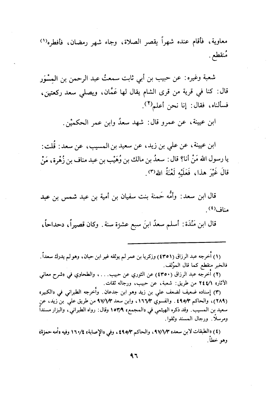 (1) أخرجه عبد الرزاق (4351) وزكريا بن عمر له يوثقه غير ابن حبان، وهو لم يدرك سعدا.