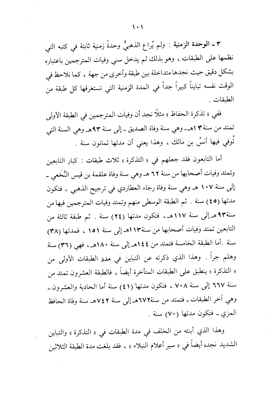 وهذا الذي أبنته من الخلف في مدة الطبقات في " التذكرة " والتباين الشديد نجده أيضا في " سير أعلام النبلاء "، فقد بلغت مدة الطبقة الثلاثين