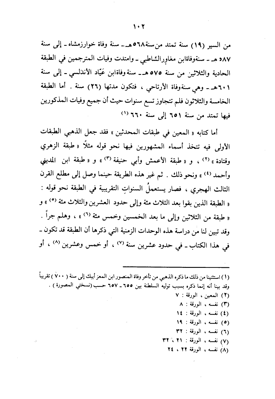 أما كتابه " المعين في طبقات المحدثين " فقد جعل الذهبي الطبقات الأولى فيه تتخذ أسماء المشهورين فيها نحو قوله مثلا " طبقة الزهري وقتادة " (2) ، و " طبقة الأعمش وأبي حنيفة (3) " و " طبقة ابن المديني وأحمد (4) " ونحو ذلك.