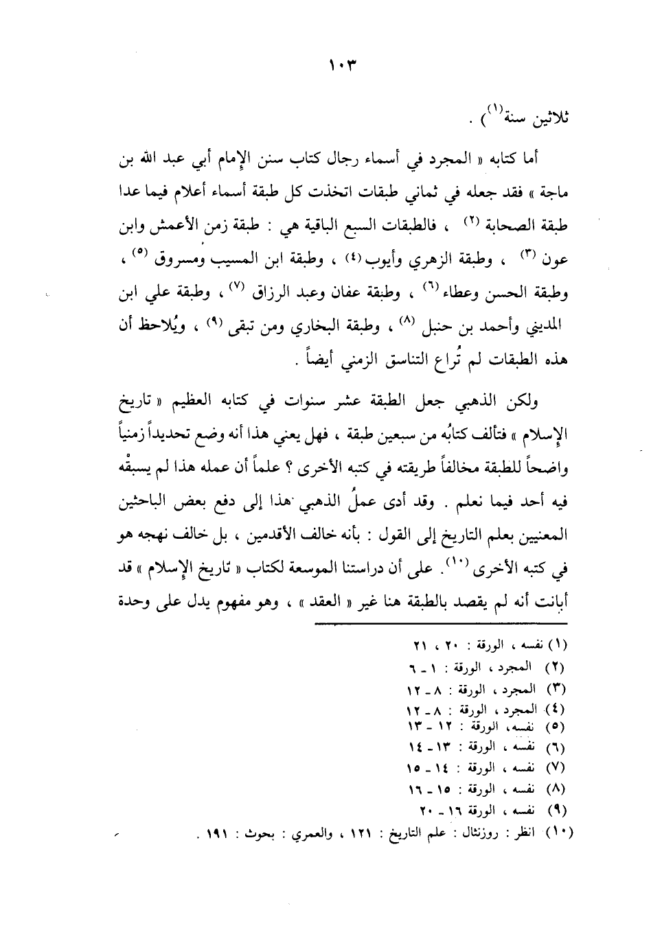 على أن دراستنا الموسعة لكتاب " تاريخ الإسلام " قد أبانت أنه لم يقصد بالطبقة هنا غير " العقد "، وهو مفهوم يدل على وحدة