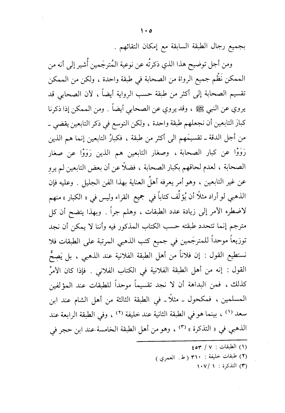 ومن الممكن إذا ذكرنا كبار التابعين أن نجعلهم طبقة واحدة، ولكن التوسع في ذكر التابعين يقضي من أجل الدقة تقسيمهم إلى أكثر من طبقة، فكبار التابعين إنما هم الذين رووا عن كبار الصحابة، وصغار التابعين هم الذين رووا عن صغار الصحابة، لعدم لحاقهم بكبار الصحابة، فضلا عن أن بعض التابعين لم يرو عن غير التابعين، وهو أمر يعرفه أهل العناية بهذا الفن الجليل.