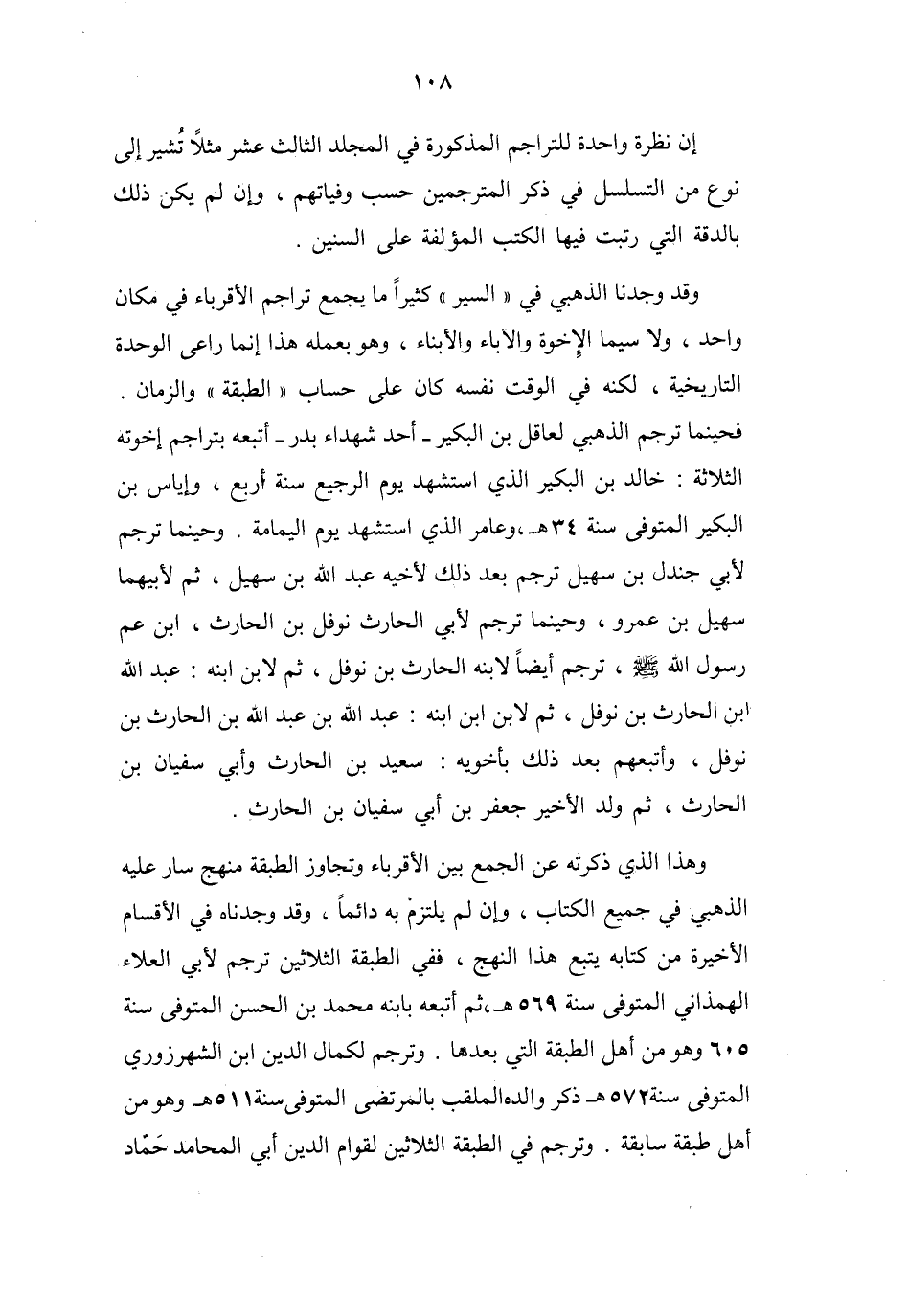وقد وجدنا الذهبي في " السير " كثيرا ما يجمع تراجم الأقرباء في مكان واحد، ولا سيما الإخوة والآباء والأبناء، وهو بعمله هذا إنما راعى الوحدة التاريخية، لكنه في الوقت نفسه كان على حساب " الطبقة " والزمان.