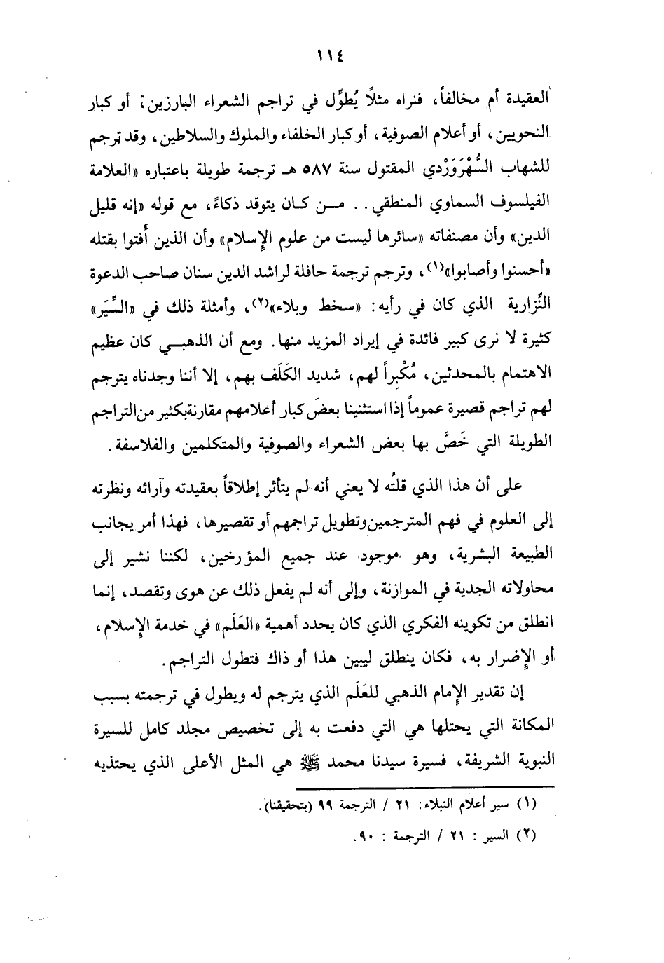 العقيدة أم مخالفا، فنراه مثلا يطول في تراجم الشعراء البارزين، أو كبار النحويين، أو أعلام الصوفية، أو كبار الخلفاء والملوك والسلاطين، وقد ترجم للشهاب السهروردي المقتول سنة 587 هـ ترجمة طويلة باعتباره " العلامة الفيلسوف السماوي المنطقي..من كان يتوقد ذكاء، مع قوله " إنه قليل الدين " وأن مصنفاته " سائرها ليست من علوم الإسلام " وأن الذين أفتوا بقتله " أحسنوا وأصابوا " (1) ، وترجم ترجمة حافلة لراشد الدين سنان صاحب الدعوة النزارية الذي كان في رأيه: " سخط وبلاء " (2) ، وأمثلة ذلك في " السير " كثيرة لا نرى كبير فائدة في إيراد المزيد منها.