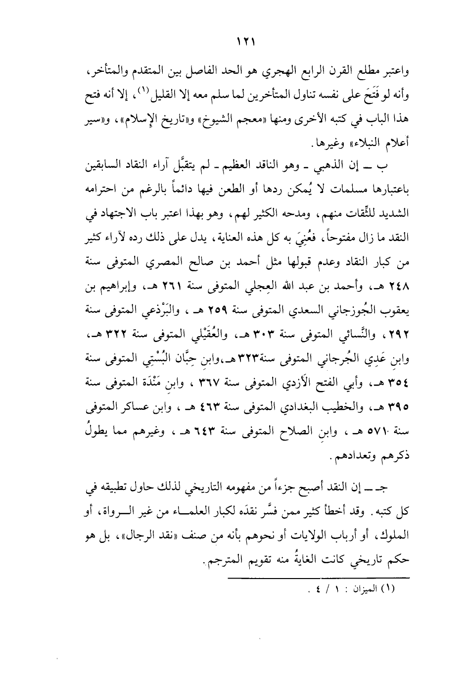 واعتبر مطلع القرن الرابع الهجري هو الحد الفاصل بين المتقدم والمتأخر، وأنه لو فتح على نفسه تناول المتأخرين لما سلم معه إلا القليل (1) ، إلا أنه فتح هذا الباب في كتبه الأخرى ومنها " معجم الشيوخ " و " تاريخ الإسلام "، و " سير أعلام النبلاء " وغيرها.