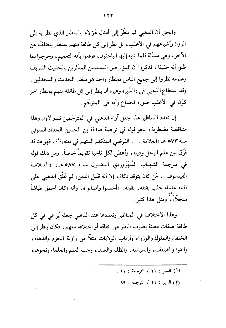 والحق أن الذهبي لم ينظر إلى أمثال هؤلاء بالمنظار الذي نظر به إلى الرواة وأشباههم في الأغلب، بل نظر إلى كل طائفة منهم بمنظار يختلف عن الآخر، وهي مسألة قلما انتبه إليها الباحثون، فوقعوا بآفة التعميم، وخرجوا بما ظنوا أنه حقيقة، فذكروا أن المؤرخين المسلمين المتأثرين بالحديث الشريف وعلومه نظروا إلى جميع الناس بمنظار واحد هو منظار الحديث والمحدثين.