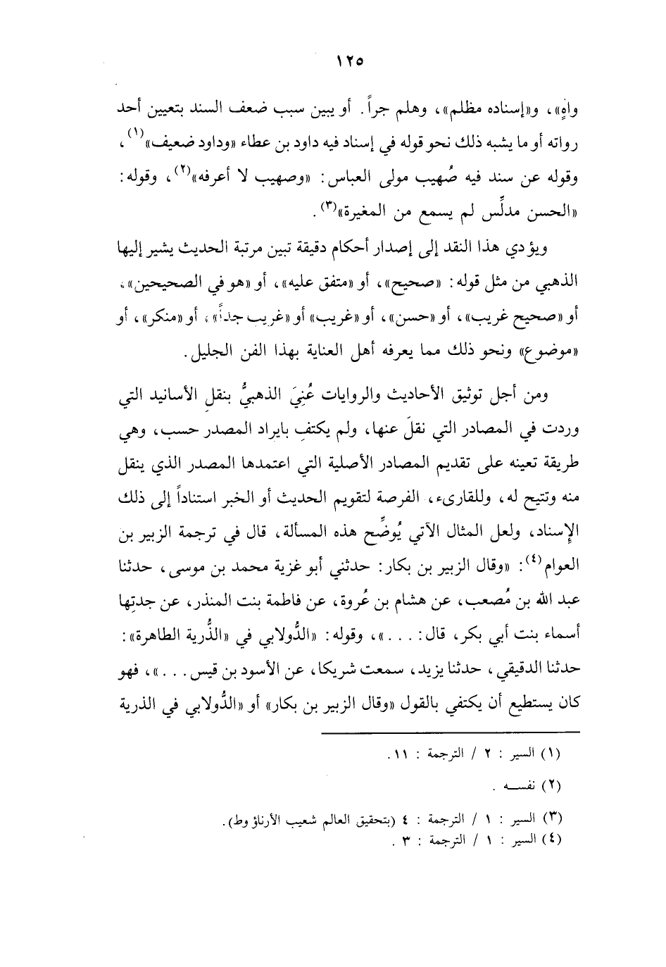 ومن أجل توثيق الأحاديث والروايات عني الذهبي بنقل الأسانيد التي وردت في المصادر التي نقل عنها، ولم يكتف بإيراد المصدر حسب، وهي طريقة تعينه على تقديم المصادر الأصلية التي اعتمدها المصدر الذي ينقل منه وتتيح له، وللقارئ، الفرصة لتقويم الحديث أو الخبر استنادا إلى ذلك الإسناد، ولعل المثال الآتي يوضح هذه المسألة، قال في ترجمة الزبير بن العوام (4) : " وقال الزبير بن بكار: حدثني أبو غزية محمد بن موسى، حدثنا عبد الله بن مصعب، عن هشام بن عروة، عن فاطمة بنت المنذر، عن جدتها أسماء بنت أبي بكر، قال:.."، وقوله: " الدولابي في " الذرية الطاهرة ": حدثنا الدقيقي، حدثنا يزيد، سمعت شريكا، عن الأسود بن قيس.."، فهو كان يستطيع أن يكتفي بالقول " وقال الزبير بن بكار " أو " الدولابي في الذرية