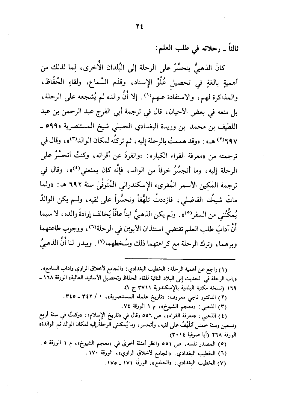 (1) راجع عن أهمية الرحلة: الخطيب البغدادي: " الجامع لأخلاق الراوي وآداب السامع "، " باب الرحلة في الحديث إلى البلاد النائية للقاء الحفاظ وتحصيل الأسانيد العالية " الورقة 168 169 (نسخة مكتبة البلدية بالإسكندرية 3711 ج 1) .