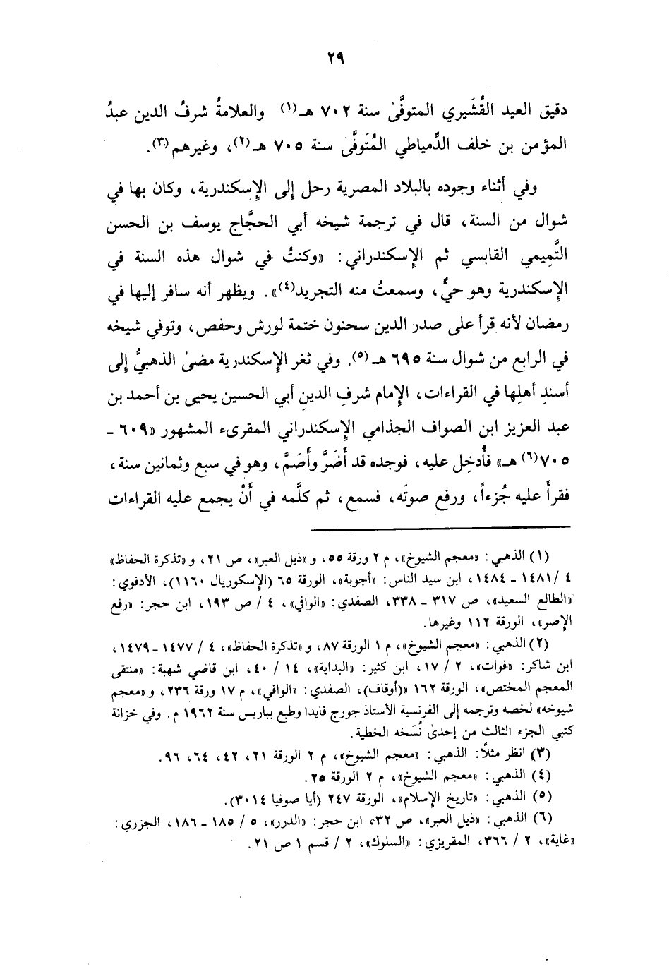 (1) الذهبي: " معجم الشيوخ "، م 2 ورقة 55، و " ذيل العبر "، ص 21، و " تذكرة الحفاظ " 4 / 1484 1481، ابن سيد الناس: " أجوبة "، الورقة 65 (الأسكوريال 1160) ، الأدفوي: " الطالع السعيد "، ص 338 317، الصفدي: " الوافي "، 4 / ص 193، ابن حجر: " رفع الإصر "، الورقة 112 وغيرها.
