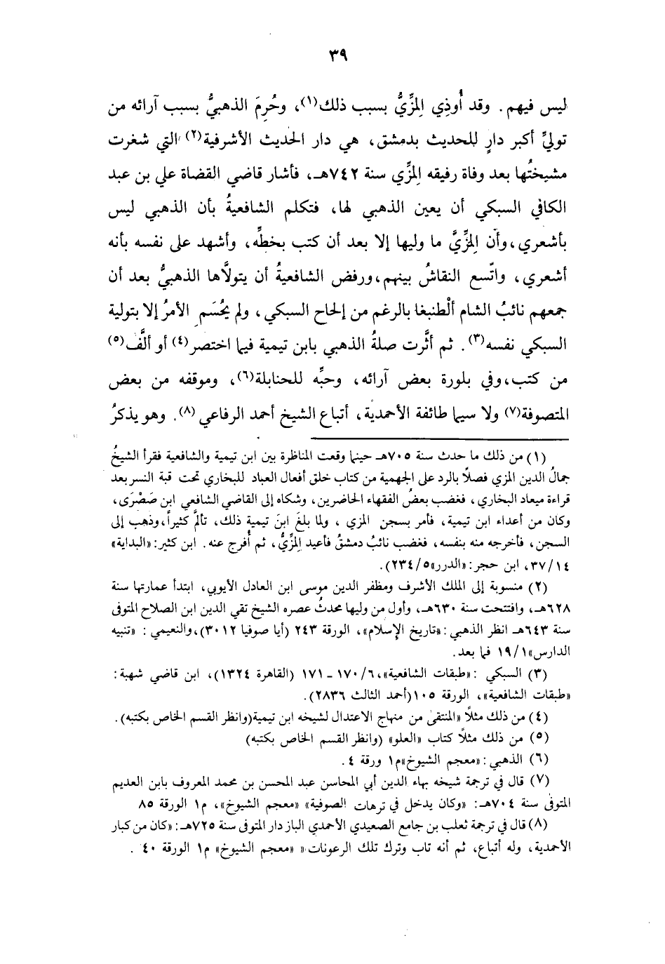 ليس فيهم. وقد أوذي المزي بسبب ذلك (1) ، وحرم الذهبي بسبب آرائه من تولي أكبر دار للحديث بدمشق، هي دار الحديث الأشرفية (2) التي شغرت مشيختها بعد وفاة رفيقه المزي سنة 742 هـ، فأشار قاضي القضاة علي بن عبد الكافي السبكي أن يعين الذهبي لها، فتكلم الشافعية بأن الذهبي ليس بأشعري، وأن المزي ما وليها إلا بعد أن كتب بخطه، وأشهد على نفسه بأنه أشعري، واتسع النقاش بينهم، ورفض الشافعية أن يتولاها الذهبي بعد أن جمعهم نائب الشام ألطنبغا بالرغم من إلحاح السبكي، ولم يحسم الأمر إلا بتولية السبكي نفسه (3) .