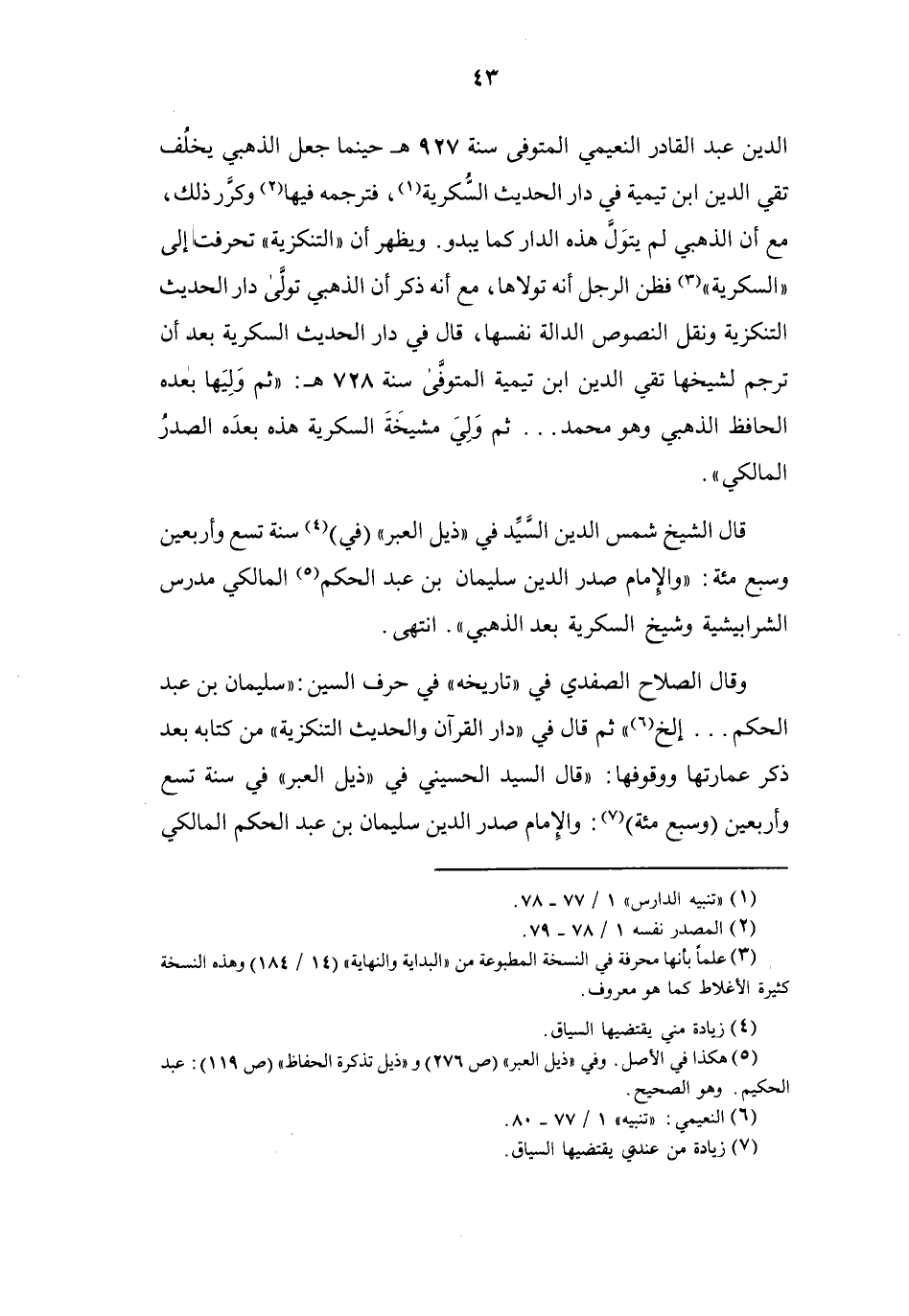 الدين عبد القادر النعيمي المتوفى سنة 927 هـ حينما جعل الذهبي يخلف تقي الدين ابن تيمية في دار الحديث السكرية (1) ، فترجمه فيها (2) وكرر ذلك، مع أن الذهبي لم يتول هذه الدار كما يبدو.