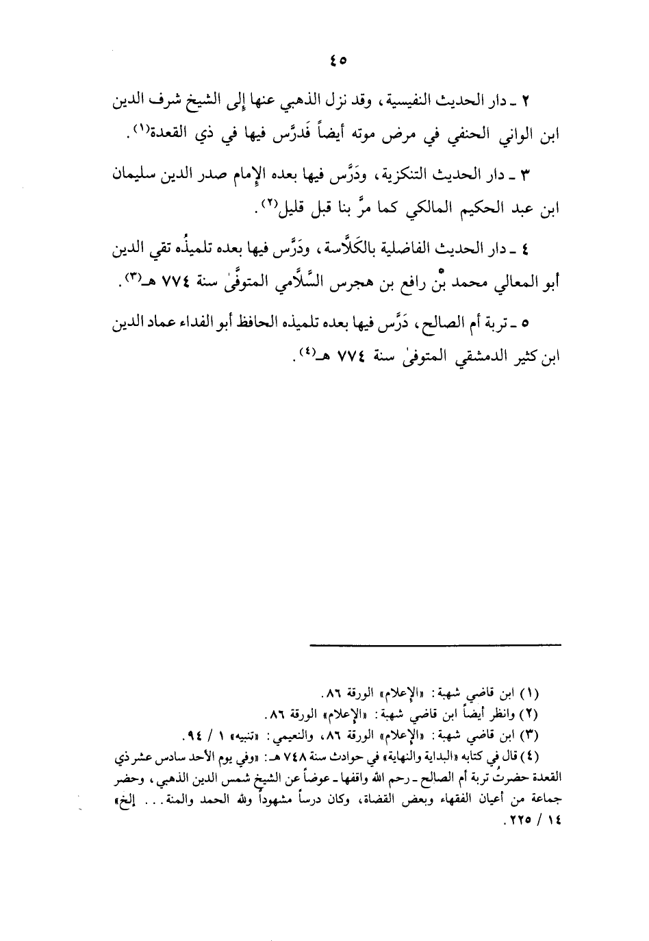 (4) قال في كتابه " البداية والنهاية " في حوادث سنة 748 هـ: " وفي يوم الأحد سادس عشر ذي القعدة حضرت تربة أم الصالح رحم الله واقفها عوضا عن الشيخ شمس الدين الذهبي، وحضر جماعة من أعيان الفقهاء وبعض القضاة، وكان درسا مشهودا ولله الحمد والمنة..إلخ " 14 / 225.