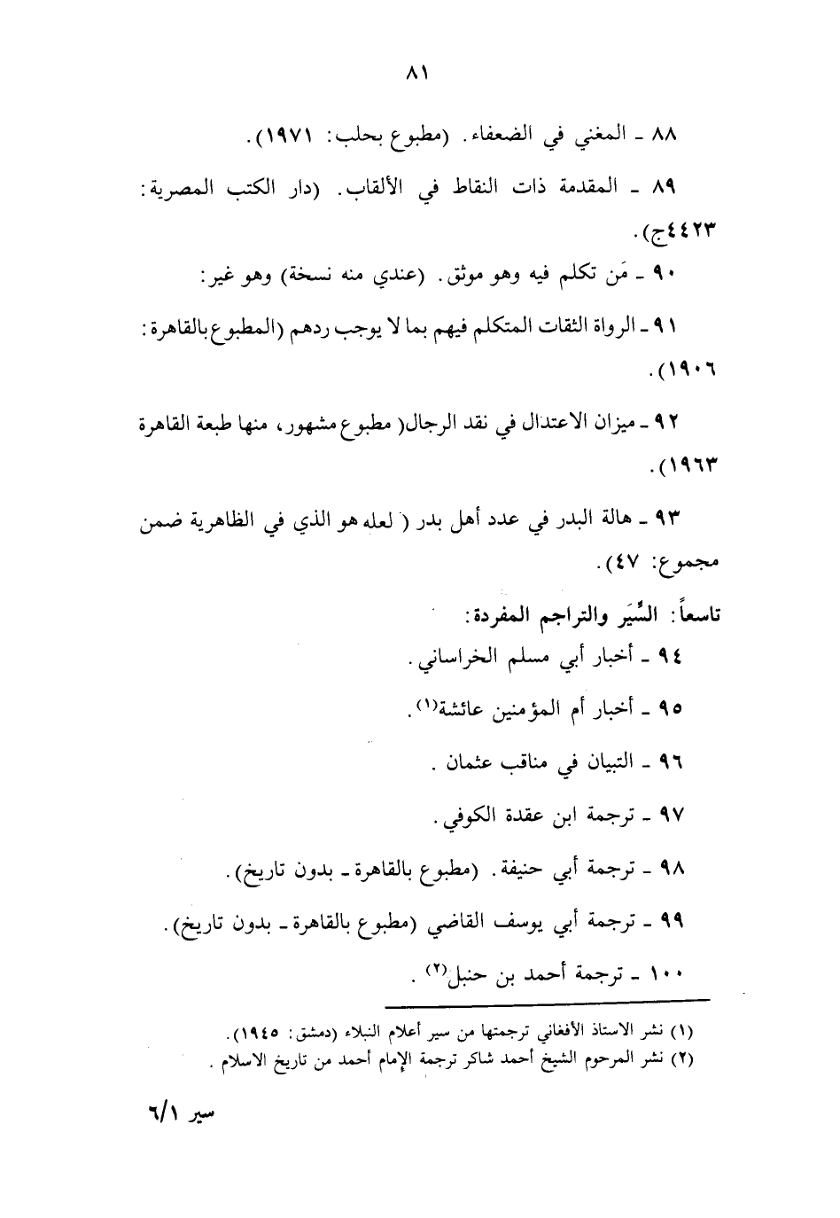 91 - الرواة الثقات المتكلم فيهم بما لا يوجب ردهم (المطبوع بالقاهرة: 1906) .
