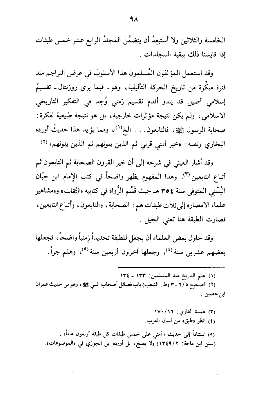 الإسلامي، ولم يكن نتيجة مؤثرات خارجية، بل هو نتيجة طبيعية لفكرة: صحابة الرسول صلى الله عليه وسلم، فالتابعون..الخ (1) ، ومما يؤيد هذا حديث أورده البخاري ونصه: " خير أمتي قرني ثم الذين يلونهم ثم الذين يلونهم " (2) وقد أشار العيني في شرحه إلى أن خير القرون الصحابة ثم التابعون ثم أتباع التابعين (3) .