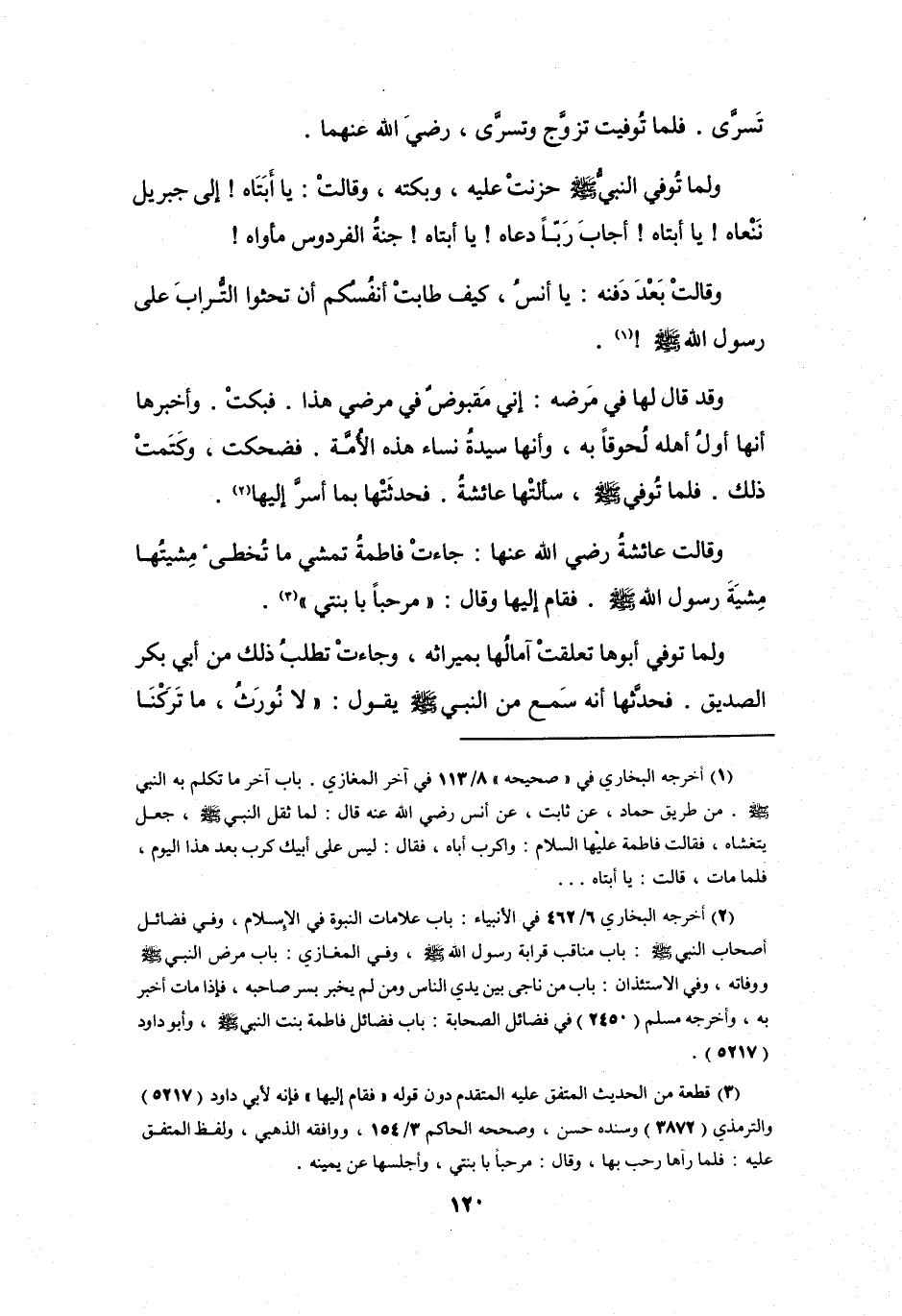 وَلَمَّا تُوُفِّيَ النَّبِيُّ -صَلَّى اللَّهُ عَلَيْهِ وَسَلَّمَ- حَزِنَتْ عَلَيْهِ، وَبَكَتْهُ، وَقَالَتْ: يَا أَبَتَاهُ! إِلَى جِبْرِيْلَ نَنْعَاهُ! يَا أَبتَاهُ! أَجَابَ رَبّاً دَعَاهُ! يَا أَبتَاهُ! جَنَّةُ الفِرْدَوْس مَأْوَاهُ!