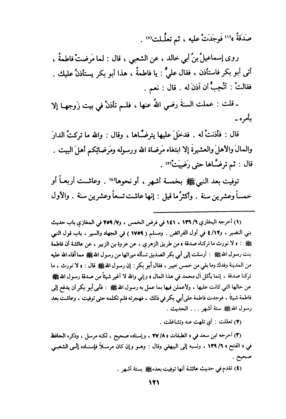 ومسلم (1759) في الجهاد والسير، باب قول النبي صلى الله عليه وسلم: " لا نورث ما تركناه صدقة " من طريق الزهري، عن عروة بن الزبير، عن عائشة أن فاطمة بنت رسول الله صلى الله عليه وسلم: أرسلت إلى أبي بكر الصديق تسأله ميراثها من رسول الله صلى الله عليه وسلم مما أفاء الله عليه من المدينة وفدك وما بقي من خمس خيبر، فقال أبو بكر: إن رسول الله صلى الله عليه وسلم قال: " لا نورث، ما تركنا صدقة، إنما يأكل آل محمد في هذا المال " وإني والله لا أغير شيئا من صدقة رسول الله صلى الله عليه وسلم عن حالها التي كانت عليها، ولاعملن فيها بما عمل به رسول الله صلى الله عليه وسلم: فأبى أبو بكر أن يدفع إلى فاطمة شيئا، فوجدت فاطمة على أبي بكر في ذلك، فهجرته فلم تكلمه حتى توفيت، وعاشت بعد رسول الله صلى الله عليه وسلم ستة أشهر ... الحديث.