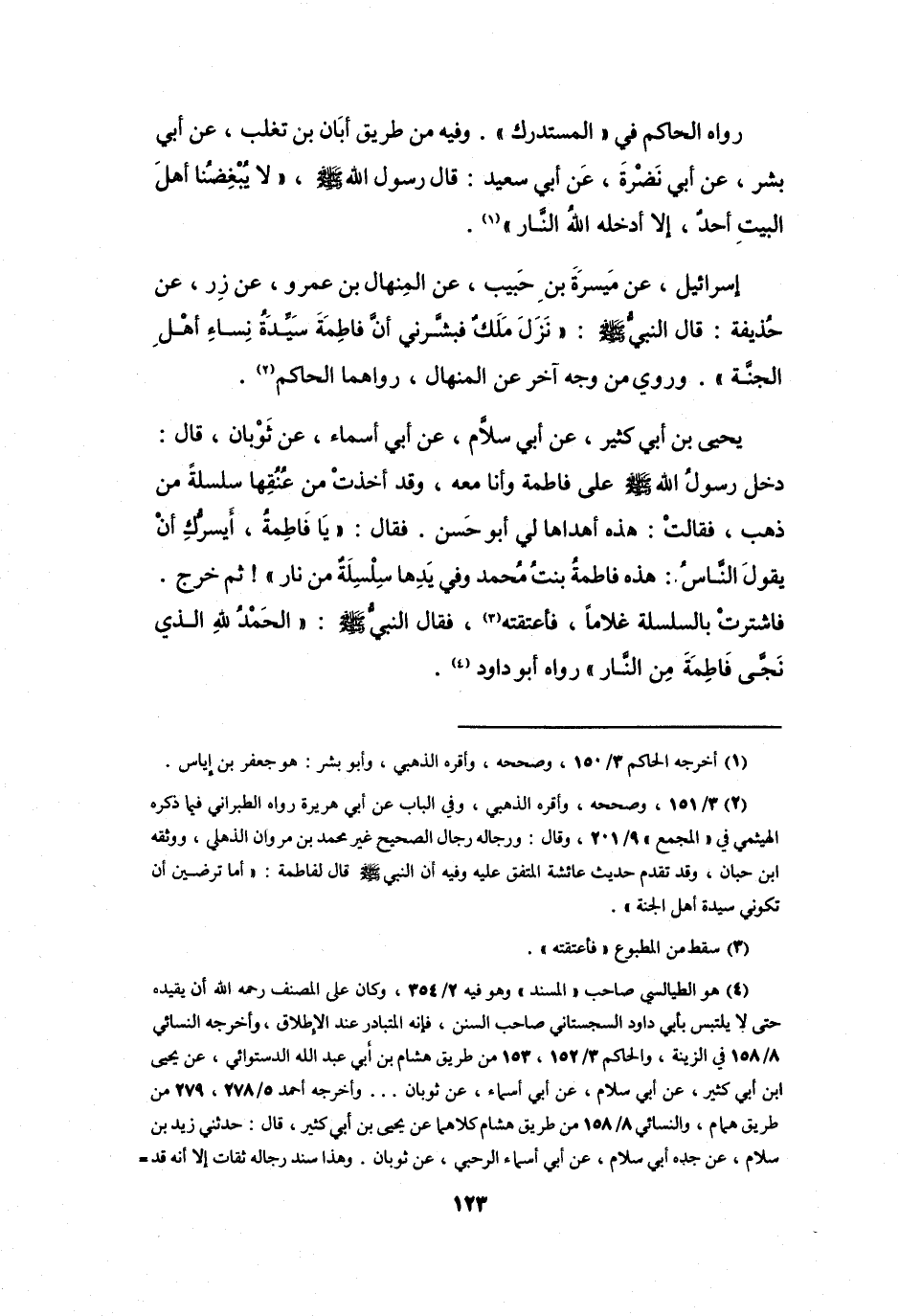 فَقَالَ النَّبِيُّ -صَلَّى اللَّهُ عَلَيْهِ وَسَلَّمَ-: (الحَمْدُ للهِ الَّذِي نَجَّى فَاطِمَةَ مِنَ النَّارِ) . رَوَاهُ أَبُو دَاوُدَ (4) .