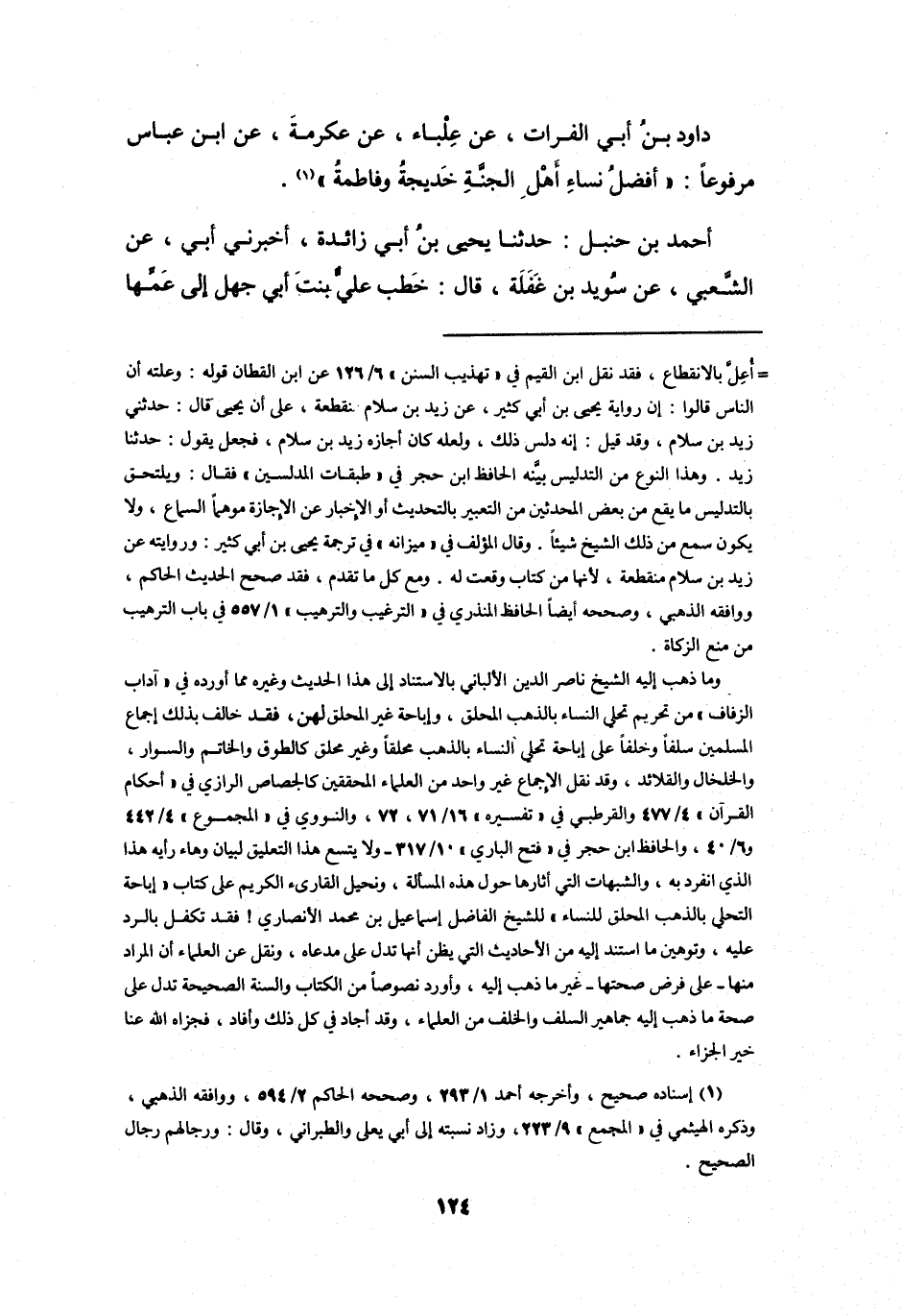 المسلمين سلفا وخلفا على إباحة تحلي النساء بالذهب محلقا وغير محلق كالطوق والخاتم والسوار، والخلخال والقلائد، وقد نقل الاجماع غير واحد من العلماء المحققين كالجصاص الرازي في " أحكام القرآن " 4 / 477 والقرطبي في " تفسيره " 16 / 71، 72، والنووي في " المجموع " 4 / 442 و6 / 40، والحافظ ابن حجر في " فتح الباري " 10 / 317 - ولا يتسع هذا التعليق لبيان وهاء رأيه هذا الذي انفرد به، والشبهات التي أثارها حول هذه المسألة، ونحيل القارئ الكريم على كتاب " إباحة التحلي بالذهب المحلق للنساء " للشسيخ الفاضل إسماعيل بن محمد الأنصاري! فقد تكفل بالرد عليه، وتوهين ما استند إليه من الأحاديث التي يظن أنها تدل على مدعاه، ونقل عن العلماء أن المراد منها - على فرض صحتها - غير ما ذهب إليه، وأورد نصوصا من الكتاب والسنة الصحيحة تدل على صحة ما ذهب إليه جماهير السلف والخلف من العلماء، وقد أجاد في كل ذلك وأفاد، فجزاه الله عنا خير الجزاء.