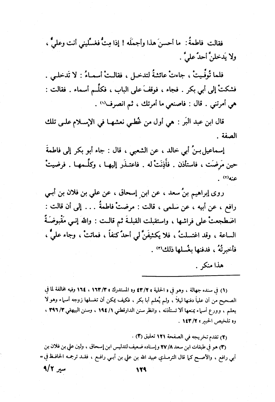 (1) في سنده جهالة، وهو في " الحلية " 2 / 43 و" المستدرك " 3 / 163، 164 وفيه مخالفة لما في الصحيح من أن عليا دفنها ليلا، ولم يعلم أبا بكر، فكيف يمكن أن تغسلها زوجه أسماء وهو لا يعلم، وورع أسماء يمنعها ألا تستأذنه، وانظر سنن الدراقطني 1 / 194، وسنن البيهقي 3 / 396، و" تلخيص الحبير " 2 / 143.