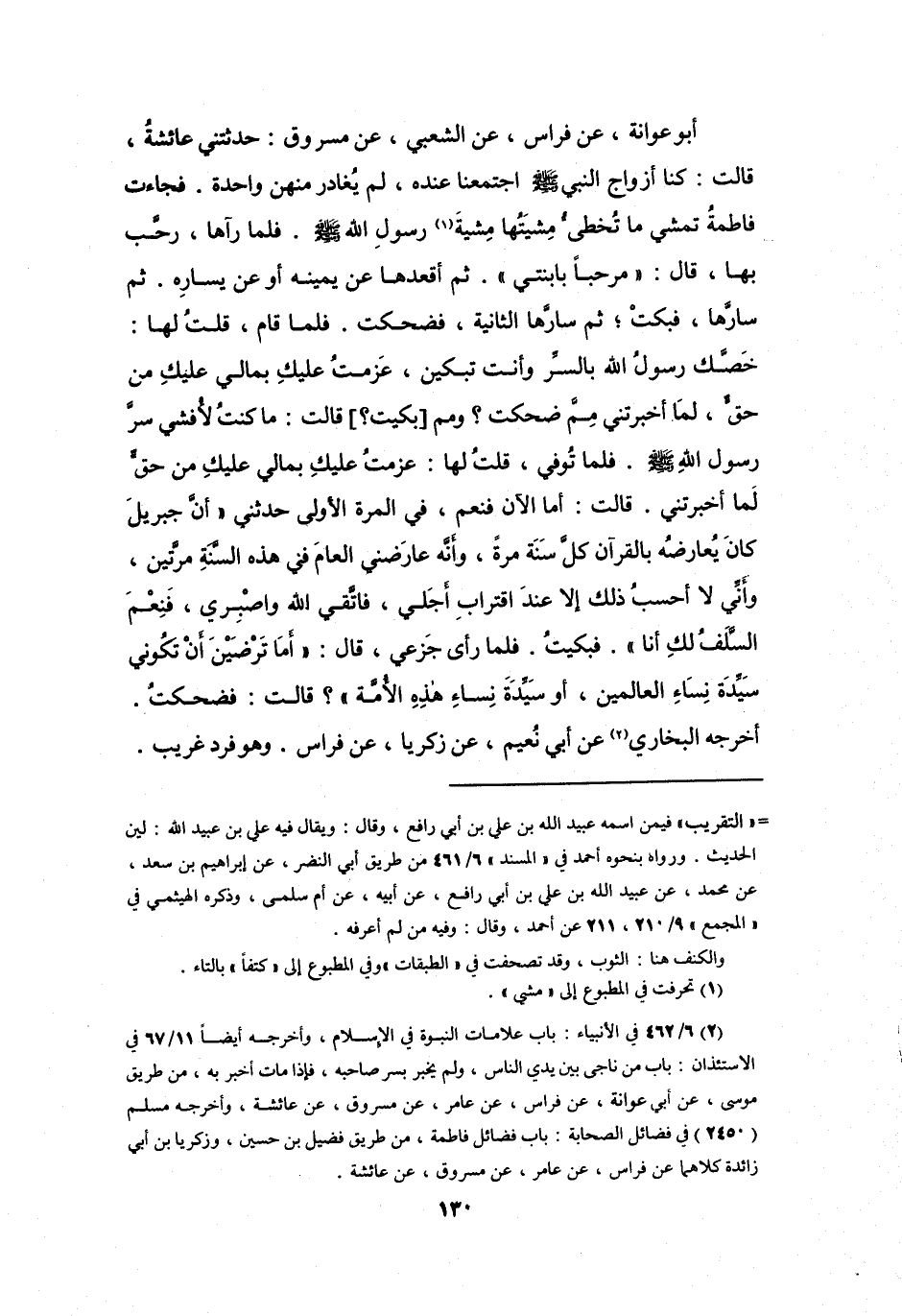 (2) 6 / 462 في الأنبياء: باب علامات النبوة في الإسلام، وأخرجه أيضا 11 / 67 في الاستئذان: باب من ناجى بين يدي الناس، ولم يخبر بسر صاحبه، فإذا مات أخبر به، من طريق موسى، عن أبي عوانة، عن فراس، عن عامر، عن مسروق، عن عائشة، وأخرجه مسلم (2450) في فضائل الصحابة: باب فضائل فاطمة، من طريق فضيل بن حسين، وزكريا بن أبي زائدة كلاهما عن فراس، عن عامر، عن مسروق، عن عائشة.