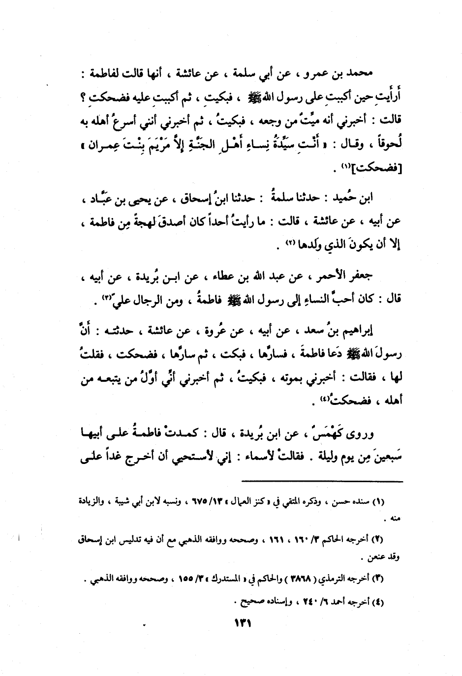 كَانَ أَحَبَّ النِّسَاءِ إِلَى رَسُوْلِ اللهِ -صَلَّى اللَّهُ عَلَيْهِ وَسَلَّمَ- فَاطِمَةُ، وَمِنَ الرِّجَالِ عَلِيٌّ (3) .