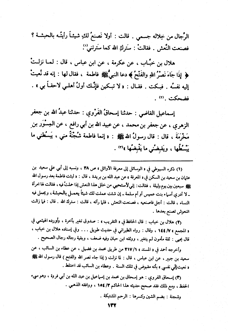 قَالَ رَسُوْلُ اللهِ -صَلَّى اللَّهُ عَلَيْهِ وَسَلَّمَ-: (إِنَّمَا فَاطِمَةُ شُجْنَةٌ مِنِّي، يَبْسُطُنِي مَا يَبْسُطُهَا، وَيَقْبِضُنِي مَا يَقْبِضُهَا) (3) .