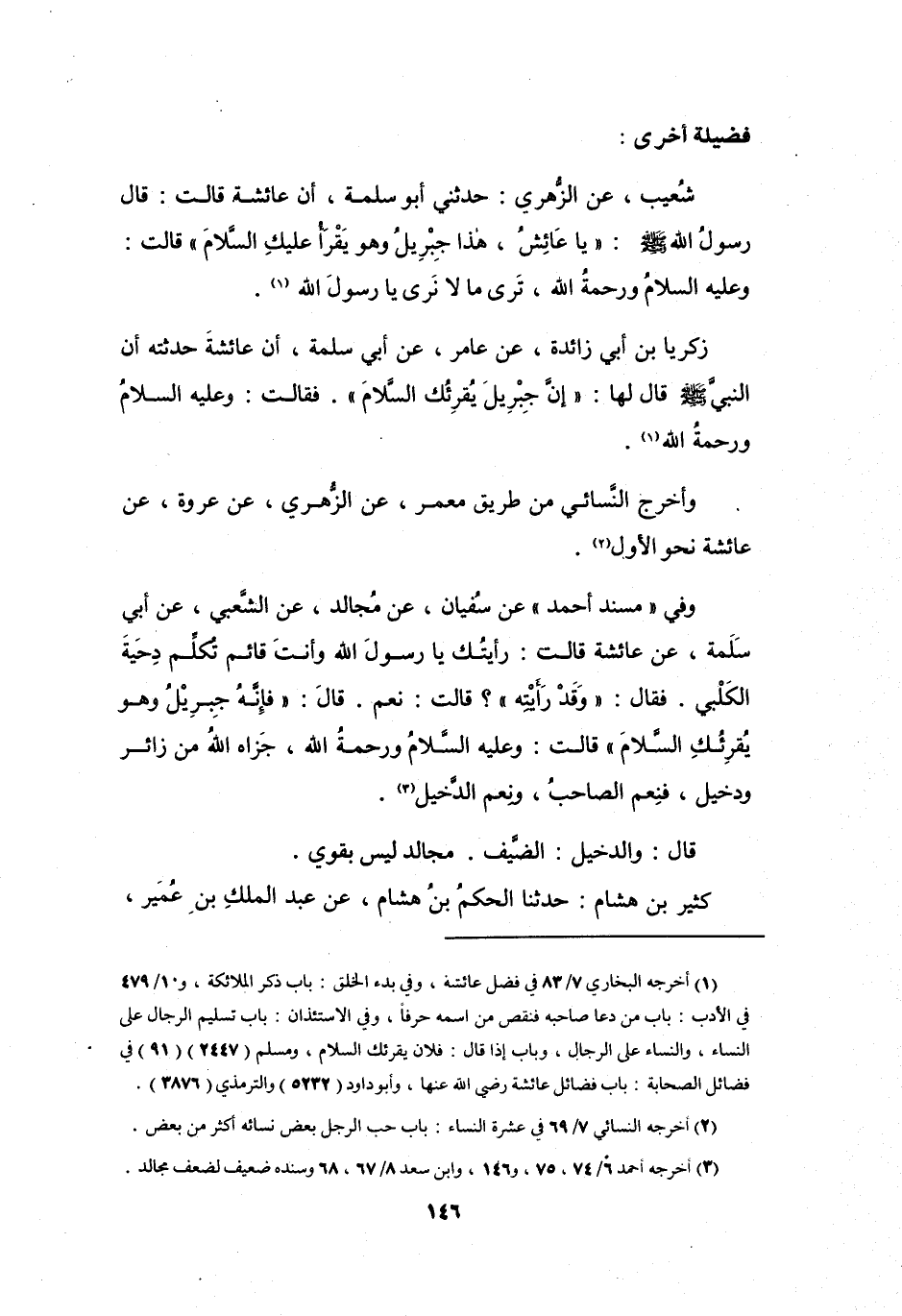 وَفِي (مُسْنَدِ أَحْمَدَ) : عَنْ سُفْيَانَ، عَنْ مُجَالِدٍ، عَنِ الشَّعْبِيِّ، عَنْ أَبِي سَلَمَةَ، عَنْ عَائِشَةَ، قَالَتْ: