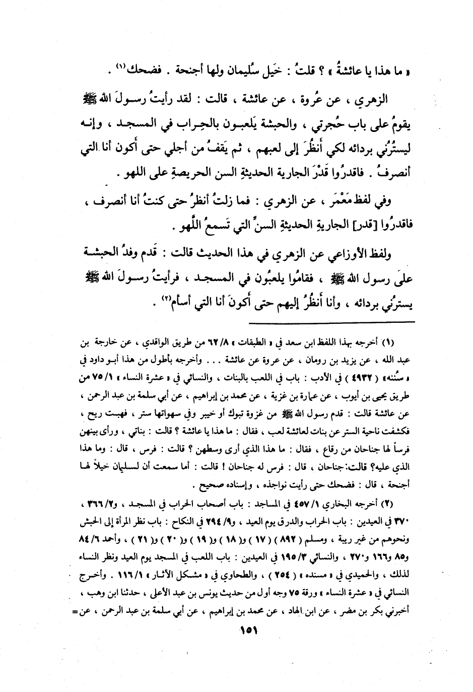 (2) أخرجه البخاري 1 / 457 في المساجد: باب أصحاب الحراب في المسجد، و2 / 366، 370 في العيدين: باب الحراب والدرق يوم العيد، و9 / 294 في النكاح: باب نظر المرأة إلى الحبش ونحوهم من غير ريبة، ومسلم (892) (17) و (18) و (19) و (20) و (21) ، وأحمد 6 / 84 و85 و166 و270، والنسائي 3 / 195 في العيدين: باب اللعب في المسجد يوم العيد ونظر النساء لذ لك، والحميدي في " مسنده " (254) ، والطحاوي في " مشكل الآثار " 1 / 116.