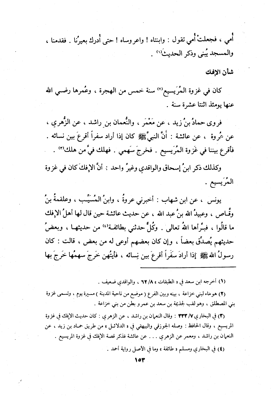 (3) في البخاري 7 / 333: وقال النعمان بن راشد، عن الزهري: كان حديث الافك في غزوة المريسيع، وقال الحافظ: وصله الجوزقي والبيهقي في " الدلائل " من طريق حماد بن زيد، عن النعمان بن راشد، ومعمر عن الزهري ... عن عائشة فذكر قصة الافك في غزوة المريسيع.