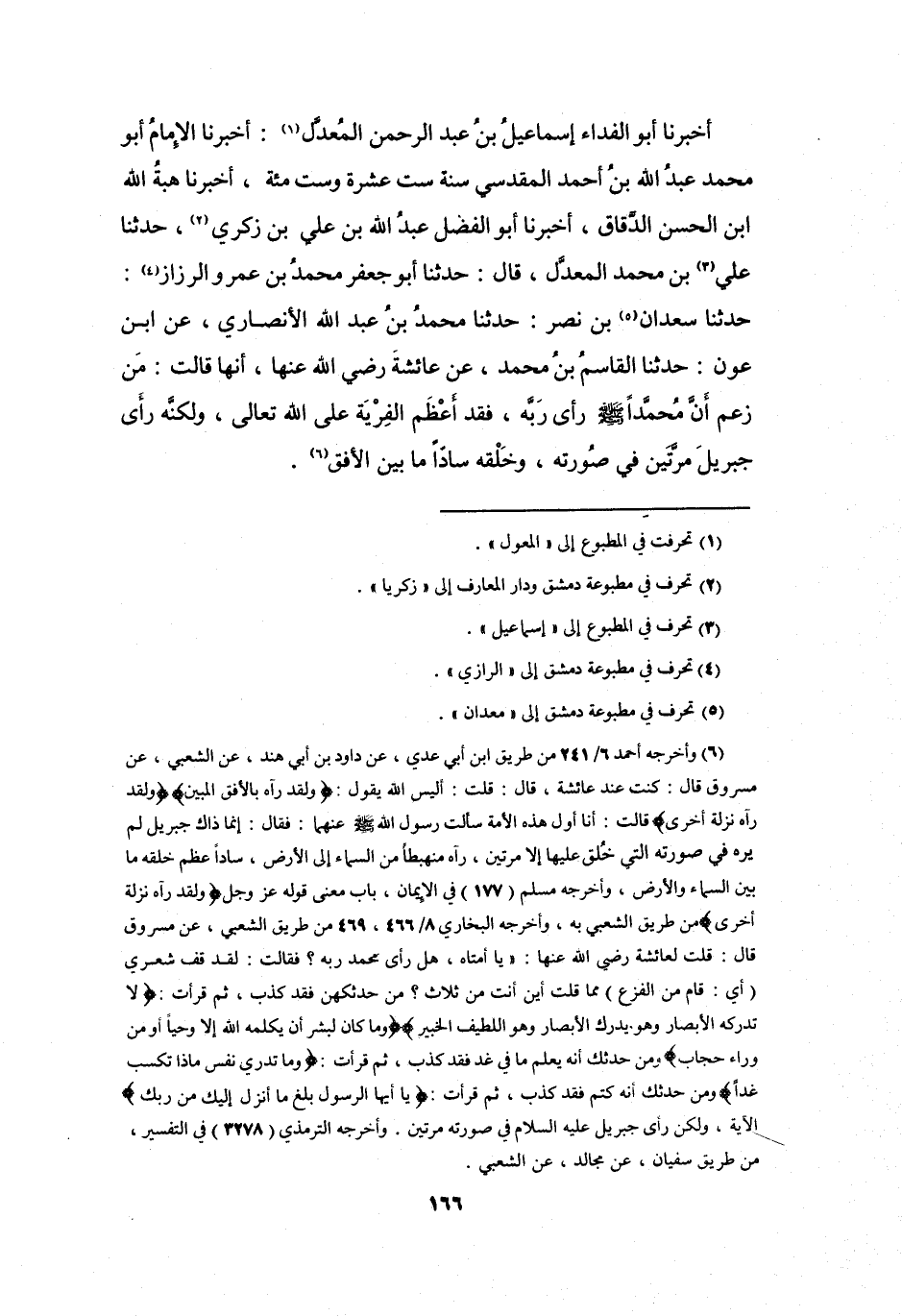 مَنْ زَعَمَ أَنَّ مُحَمَّداً -صَلَّى اللَّهُ عَلَيْهِ وَسَلَّمَ- رَأَى رَبَّهُ، فَقَدْ أَعْظَمَ الفِرْيَةَ عَلَى اللهِ -تَعَالَى- وَلَكِنَّهُ رَأَى جِبْرِيْلَ مَرَّتَيْنِ فِي صُوْرَتِهِ وَخَلْقِهِ سَادّاً مَا بَيْنَ الأُفُقِ (6) .