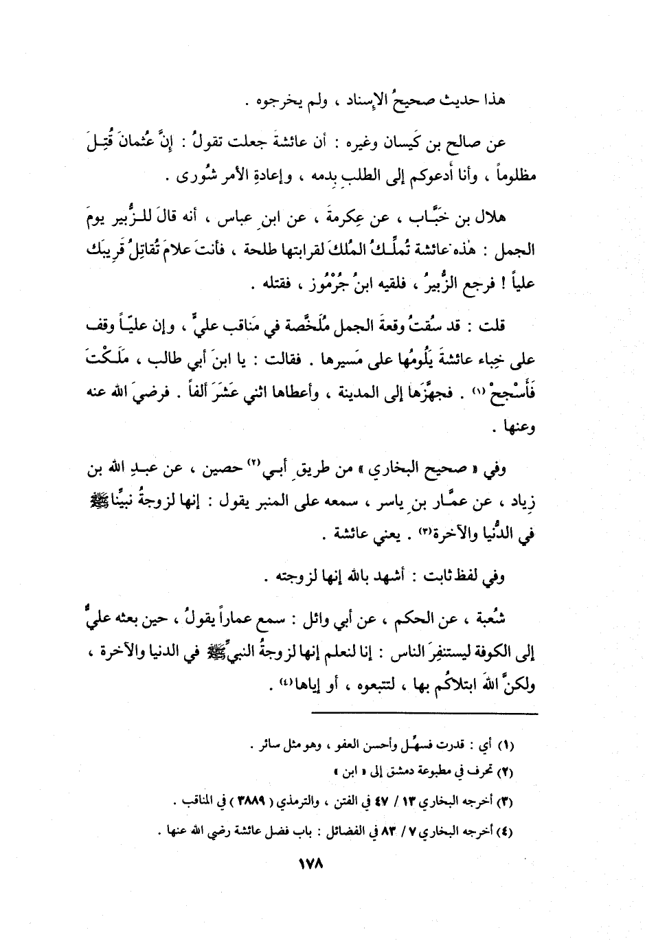 قُلْتُ: قَدْ سُقْتُ وَقْعَةَ الجَمَلِ مُلَخَّصَةً فِي مَنَاقِبِ عَلِيٍّ، وَإِنَّ عَلِيّاً وَقَفَ عَلَى خِبَاءِ عَائِشَةَ يَلُوْمُهَا عَلَى مَسِيْرِهَا.