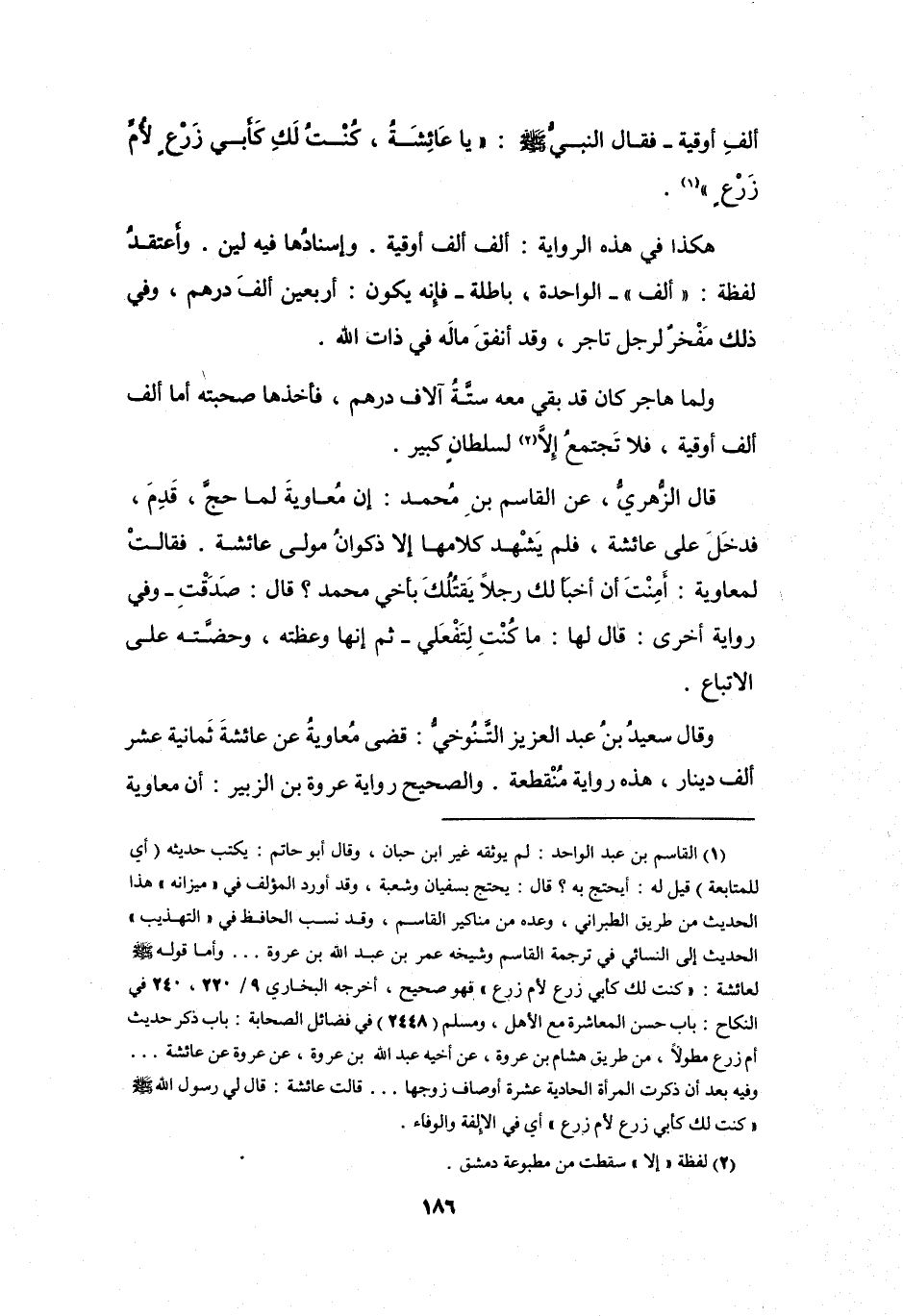 للمتابعة) قيل له: أيحتج به؟ قال: يحتج بسفيان وشعبة، وقد أورد المؤلف في " ميزانه " هذا الحديث من طريق الطبراني، وعده من مناكير القاسم، وقد نسب الحافظ في " التهذيب " الحديث إلى النسائي في ترجمة القاسم وشيخه عمر بن عبد الله بن عروة ... وأما قوله صلى الله عليه وسلم لعائشة: " كنت لك كأبي زرع لام زرع " فهو صحيح، أخرجه البخاري 9 / 220، 240 في النكاح: باب حسن المعاشرة مع الأهل، ومسلم (2448) في فضائل الصحابة: باب ذكر حديث أم زرع مطولا، من طريق هشام بن عروة، عن أخيه عبد الله بن عروة، عن عروة بن عائشة ... وفيه بعد أن ذكرت المرأة الحادية عشرة أوصاف زوجها ... قالت عائشة: قال لي رسول الله صلى الله عليه وسلم " كنت لك كأبي زرع لام زرع " أي في الالفة والوفاء.