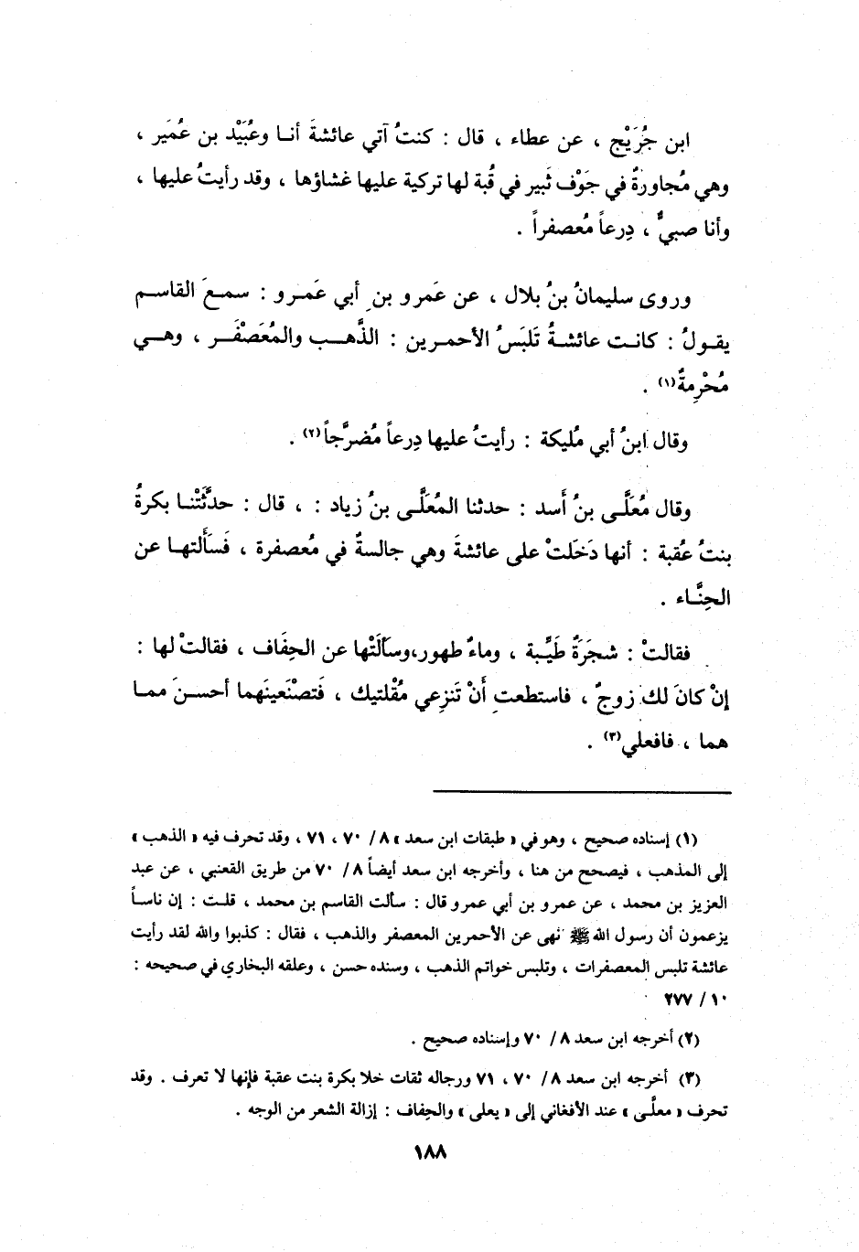 (1) إسناده صحيح، وهو في " طبقات ابن سعد " 8 / 70، 71، وقد تحرف فيه " الذهب " إلى المذهب، فيصحح من هنا، وأخرجه ابن سعد أيضا 8 / 70 من طريق القعنبي، عن عبد العزيز بن محمد، عن عمرو بن أبي عمرو قال: سألت القاسم بن محمد، قلت: إن ناسا يزعمون أن رسول الله صلى الله عليه وسلم نهى عن الاحمرين المعصفر والذهب، فقال: كذبوا والله لقد رأيت عائشة تلبس المعصفرات، وتلبس خواتم الذهب، وسنده حسن، وعلقه البخاري في صحيحه: 10 / 277.