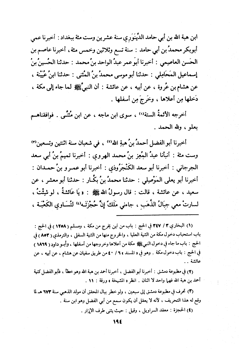 وهو في " المسند " 6 / 40 من طريق سفيان عن هشام، عن أبيه، عن عائشة.. (2) في مطبوعة دمشق: أخبرنا أبو الفضل، أخبرنا أحمد بن هبة الله وهو خطأ، فأبو الفضل كنية أحمد بن هبة الله فهما واحد لا اثنان.