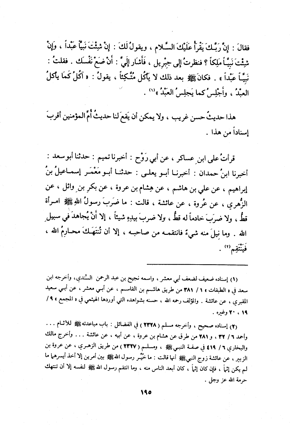 مَا ضَرَبَ رَسُوْلُ اللهِ -صَلَّى اللَّهُ عَلَيْهِ وَسَلَّمَ- امْرَأَةً قَطُّ، وَلاَ ضَرَبَ خَادِماً لَهُ قَطُّ، وَلاَ ضَرَبَ بِيَدِهِ شَيْئاً، إِلاَّ أَنْ يُجَاهِدَ فِي سَبِيْلِ اللهِ، وَمَا نِيْلَ مِنْهُ شَيْءٌ فَانْتَقَمَهُ مِنْ صَاحِبِهِ، إِلاَّ أَنْ تُنْتَهَكَ مَحَارِمُ اللهِ، فَيَنْتَقِمُ (2) .