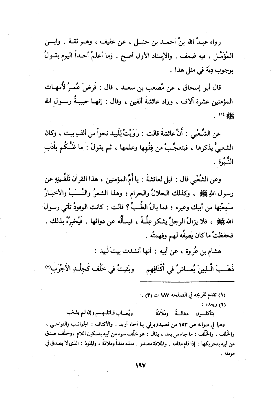 عَنِ الشَّعْبِيِّ: أَنَّ عَائِشَةَ قَالَتْ: رَوَيْتُ لِلَبِيْدٍ نَحْواً مِنْ أَلْفِ بَيْتٍ، وَكَانَ الشَّعْبِيُّ يَذْكُرُهَا، فَيَتَعَجَّبُ مِنْ فِقْهِهَا وَعِلْمِهَا، ثُمَّ يَقُوْلُ: مَا ظَنُّكُمْ بِأَدَبِ النُّبُوَةِ.