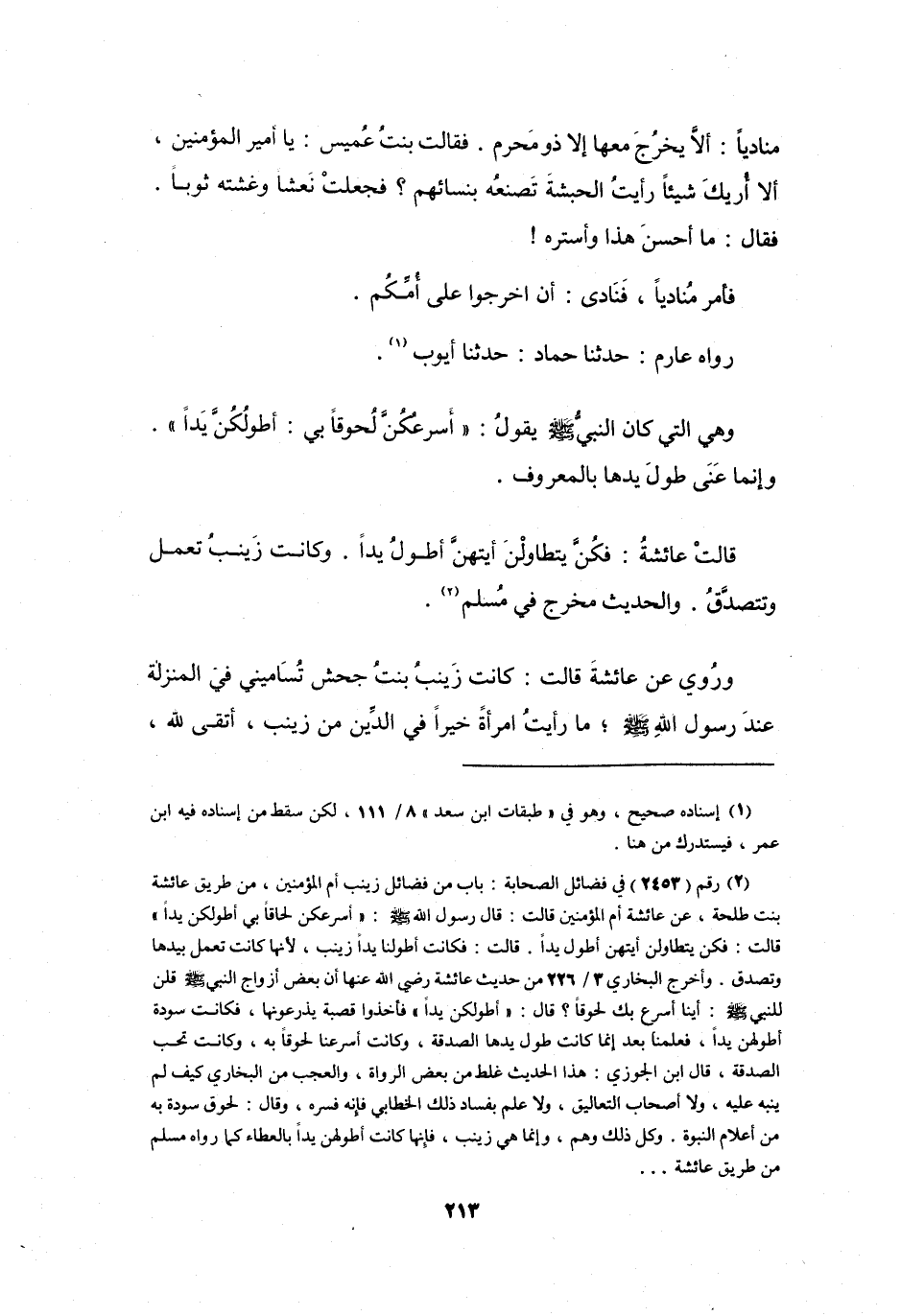 (2) رقم (2453) في فضائل الصحابة: باب من فضائل زينب أم المؤمنين، من طريق عائشة بنت طلحة، عن عائشة أم المؤمنين قالت: قال رسول الله صلى الله عليه وسلم: " أسرعكن لحاقا بي أطولكن يدا "