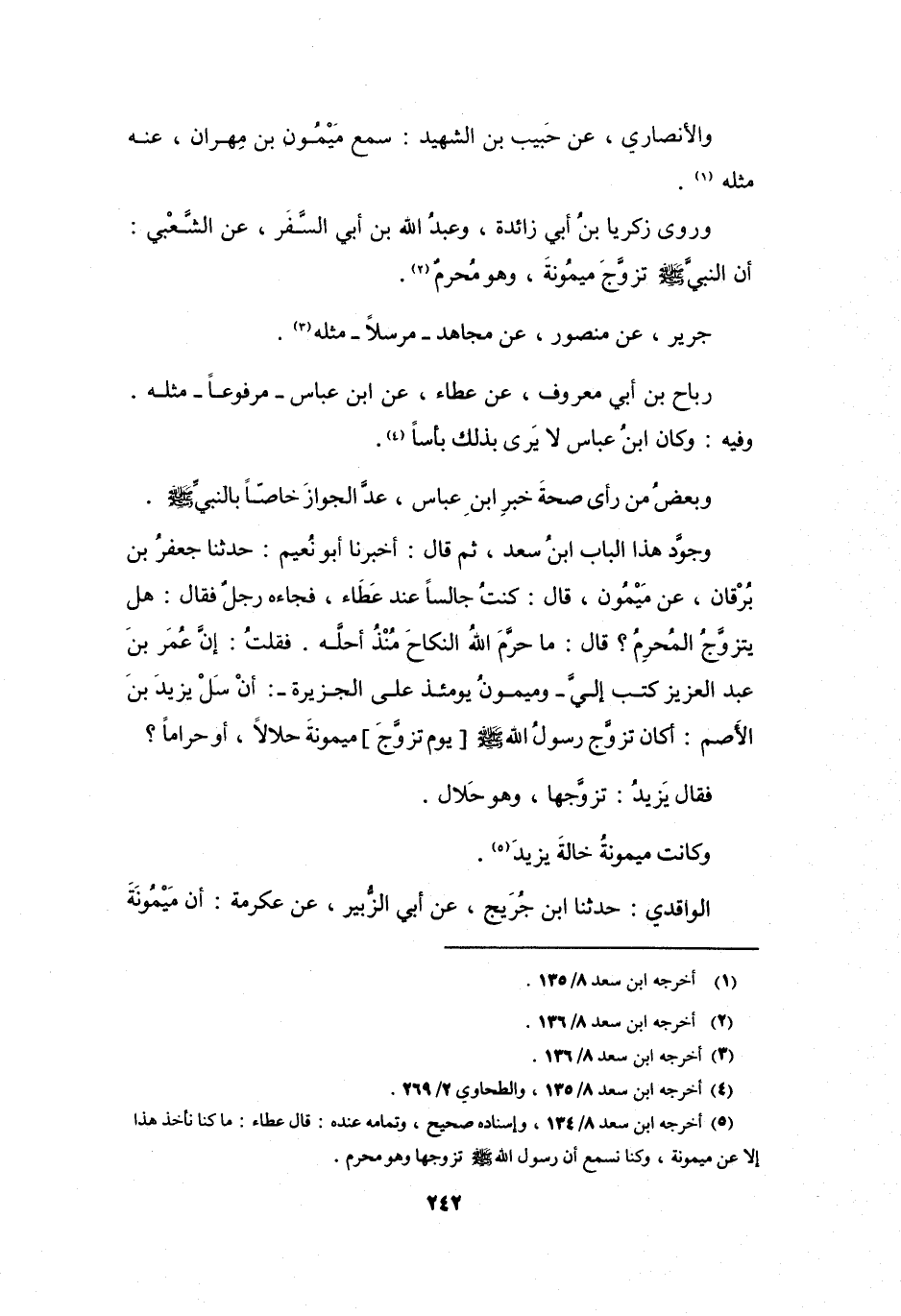 فَقُلْتُ: إِنَّ عُمَرَ بنَ عَبْدِ العَزِيْزِ كَتَبَ إِلَيَّ - وَمَيْمُوْنٌ يَوْمَئِذٍ عَلَى الجَزِيْرَةِ -: أَنْ سَلْ يَزِيْدَ بنَ الأَصَمِّ: أَكَانَ تَزَوَّجَ رَسُوْلُ اللهِ -صَلَّى اللَّهُ عَلَيْهِ وَسَلَّمَ- يَوْمَ تَزَوَّجَ مَيْمُوْنَةَ حَلاَلاً، أَوْ حَرَاماً؟