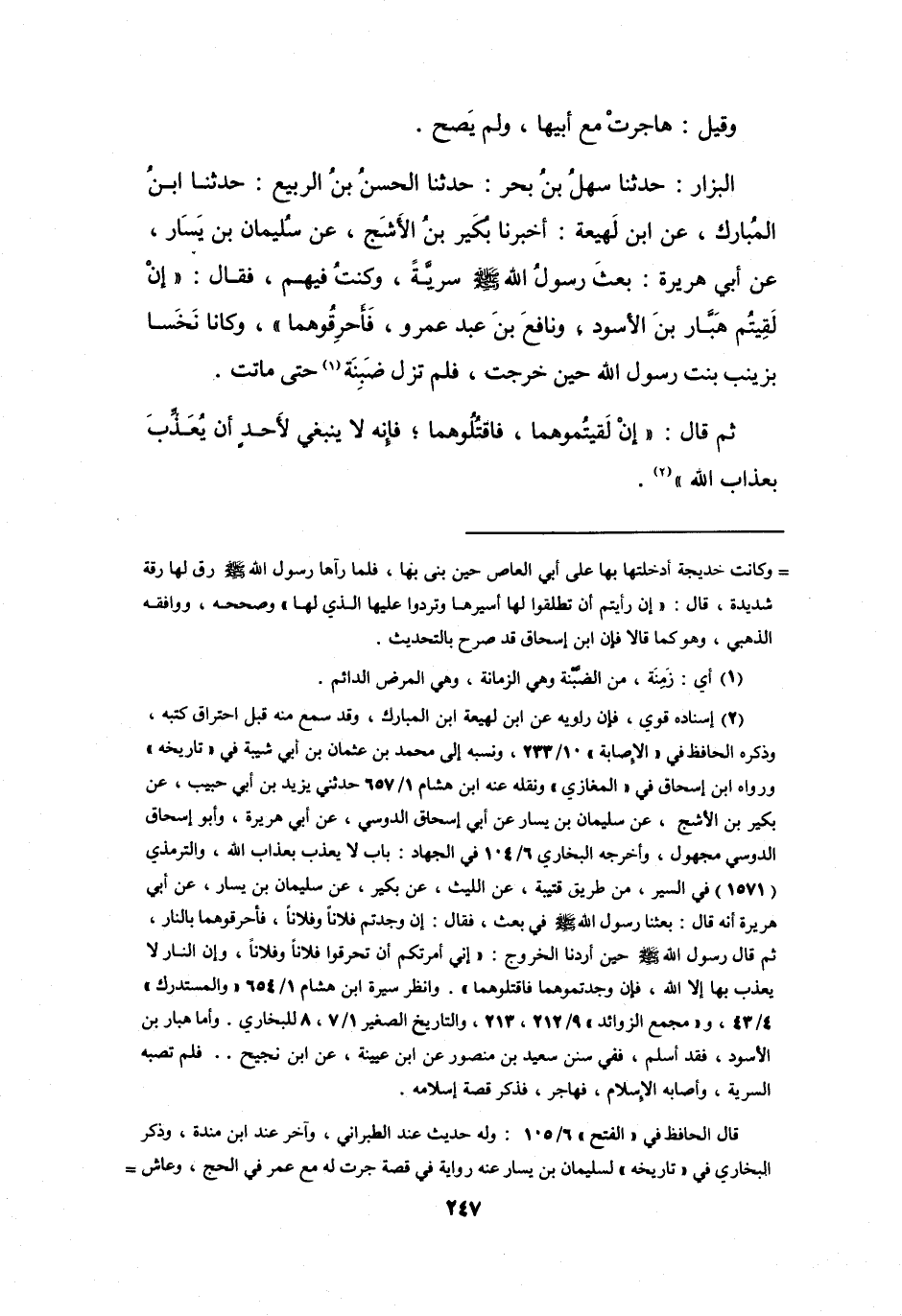 (2) إسناده قوي، فإن راويه عن ابن لهيعة ابن المبارك، وقد سمع منه قبل احتراق كتبه، وذكره الحافظ في " الإصابة " 10 / 233، ونسبه إلى محمد بن عثمان بن أبي شيبة في " تاريخه " ورواه ابن إسحاق في " المغازي " ونقله عنه ابن هشام 1 / 657 حدثني يزيد بن أبي حبيب، عن بكير بن الاشج، عن سليمان بن يسار عن أبي إسحاق الدوسي، عن أبي هريرة، وأبو إسحاق الدوسي مجهول، وأخرجه البخاري 6 / 104 في الجهاد: باب لا يعذب بعذاب الله، والترمذي (1571) في السير، من طريق قتيبة، عن الليث، عن بكير، عن سليمان بن يسار، عن أبي هريرة أنه قال: بعثنا رسول الله صلى الله عليه وسلم في بعث، فقال: إن وجدتم فلانا وفلانا، فأحرقوهما بالنار، ثم قال رسول الله صلى الله عليه وسلم حين أردنا الخروج: " إني أمرتكم أن تحرقوا فلانا وفلانا، وإن النار لا يعذب بها إلا الله، فإن وجدتموهما فاقتلوهما ".