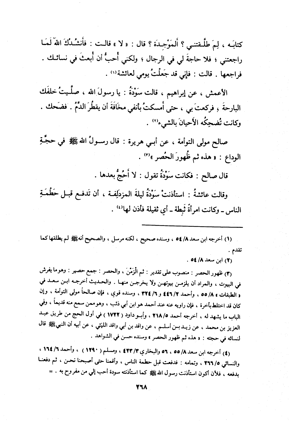 (4) أخرجه ابن سعد 8 / 55، 56 والبخاري 3 / 423، ومسلم (1290) ، وأحمد 6 / 164، والنسائي 5 / 266، وتمامه: فدفعت قبل حطمة الناس، وأقمنا حتى أصبحنا نحن، ثم دفعنا بدفعه، فلان أكون استأذنت رسول الله صلى الله عليه وسلم كما استأذنته سودة أحب إلي من مفروح به. =