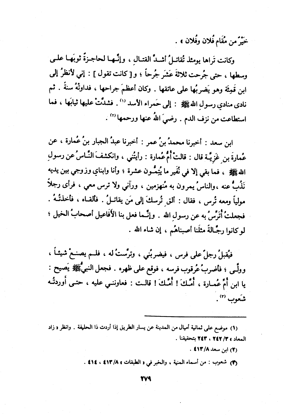 قَالَتْ أُمُّ عُمَارَةَ: رَأَيْتُنِي، وَانْكَشَفَ النَّاسُ عَنْ رَسُوْلِ اللهِ -صَلَّى اللَّهُ عَلَيْهِ وَسَلَّمَ- فَمَا بَقِيَ إِلاَّ فِي نُفَيْرٍ مَا يُتِمُّونَ عَشَرَةً، وَأَنَا وَابْنَايَ وَزَوْجِي بَيْنَ يَدَيْهِ نَذُبُّ عَنْهُ، وَالنَّاسُ يَمُرُّوْنَ بِهِ مُنْهَزِمِيْنَ، وَرَآنِي وَلاَ تُرْسَ مَعِي، فَرَأَى رَجُلاً مُوَلِّياً وَمَعَهُ تُرْسٌ، فَقَالَ: (أَلْقِ تُرْسَكَ إِلَى مَنْ يُقَاتِلُ) .