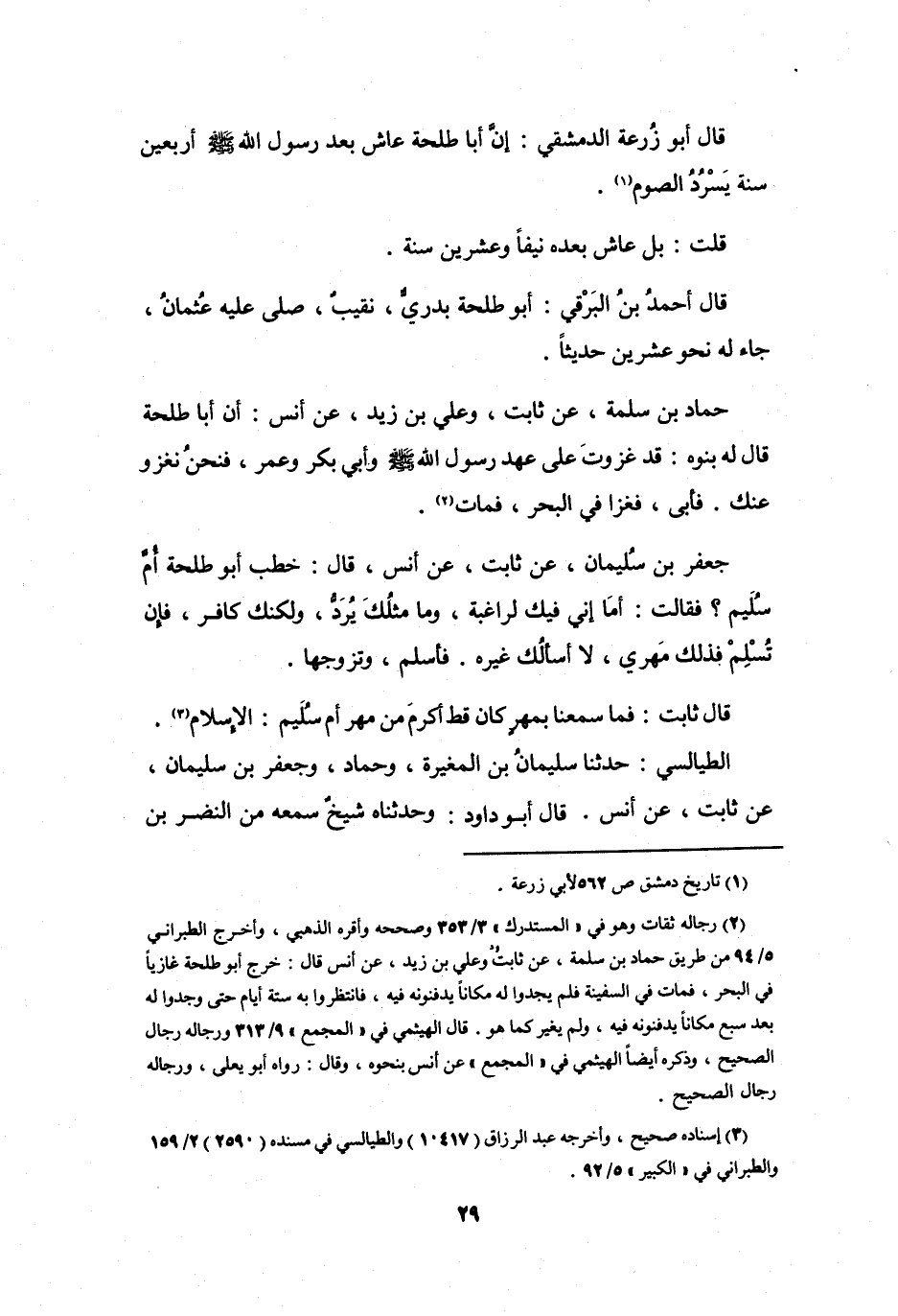 قَالَ أَبُو زُرْعَةَ الدِّمَشْقِيُّ: إِنَّ أَبَا طَلْحَةَ عَاشَ بَعْدَ رَسُوْلِ اللهِ -صَلَّى اللَّهُ عَلَيْهِ وَسَلَّمَ- أَرْبَعِيْنَ سَنَةً يَسْرُدُ الصَّوْمَ (1) .