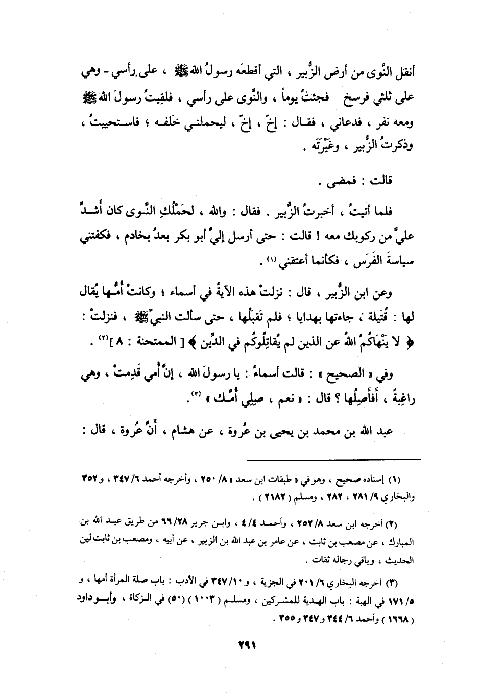 وَعَنِ ابْنِ الزُّبَيْرِ، قَالَ: نَزَلَتْ هَذِهِ الآيَةُ فِي أَسْمَاءَ؛ وَكَانَتْ أُمُّهَا يُقَالُ لَهَا: قُتَيْلَةُ، جَاءتْهَا بِهَدَايَا؛ فَلَمْ تَقْبَلْهَا، حَتَّى سَأَلَتِ النَّبِيَّ -صَلَّى اللَّهُ عَلَيْهِ وَسَلَّمَ-.