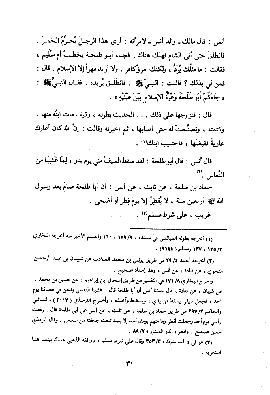 وأخرج البخاري 8 / 171 في التفسير من طريق إسحاق بن إبراهيم، عن حسين بن محمد، عن شيبان، عن قتادة، قال حدثنا أنس أن أبا طلحة قال: غشينا النعاس ونحن في مصافنا يوم احد، فجعل سيفي يسقط من يدي، ويسقط وآخذه، وأخرج الترمذي (3007) والنسائي والحاكم 2 / 297 من طريق حماد بن سلمة، عن ثابت، عن أنس عن أبي طلحة قال: رفعت رأسي يوم أحد وجعلت أنظر وما منهم يومئذ أحد إلا يميد تحت جحفته من النعاس.